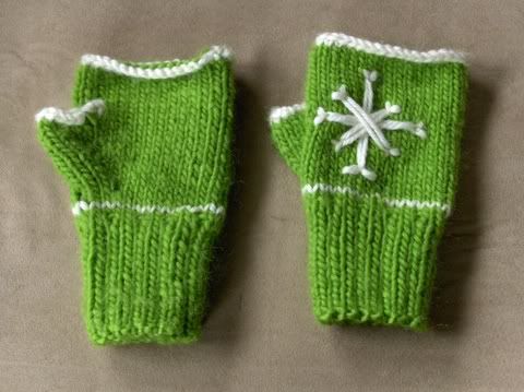 Then, I made these fingerless mittens, just by ending early on the mitten pattern. The snowflakes I added myself.