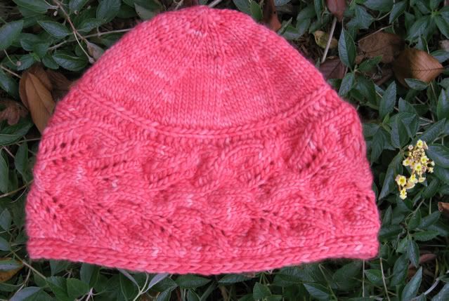 As with the scarf, I knit the hat with the luscious Malabrigo and size 7 needles for the hat band, size 8-16" circs and dpns for the top portion of the hat.