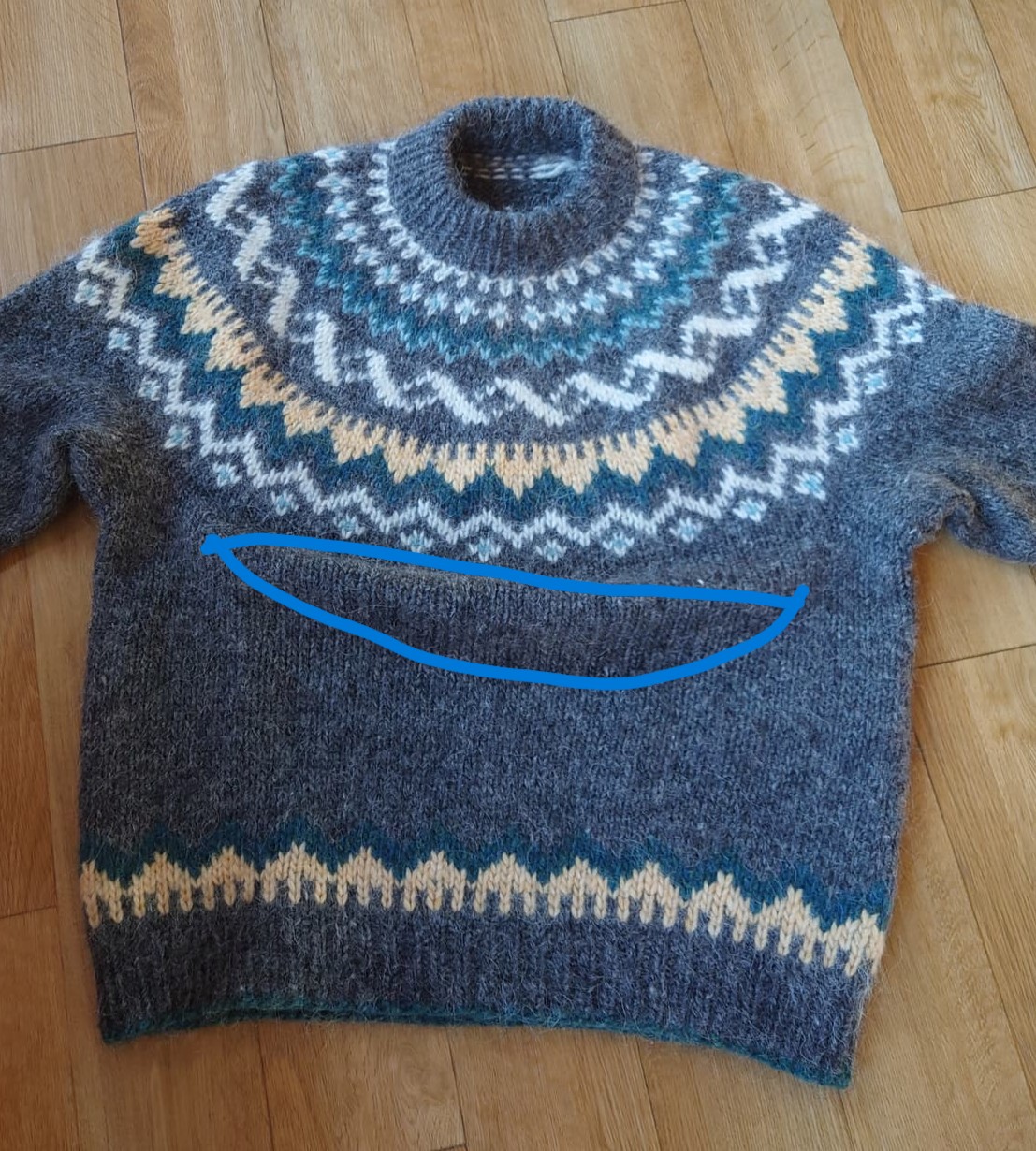 I’d frog and make the same pattern on a set in or modified drop sleeve instead. Not what you wanted to hear but I’d enjoy the colourwork and wouldn’t enjoy trying to fix the pooch so it would be the way to go for me. Either that or I’d feed him a lot of Jaffa cakes to fill the pooch out. Or make a big front pocket to keep snacks in.