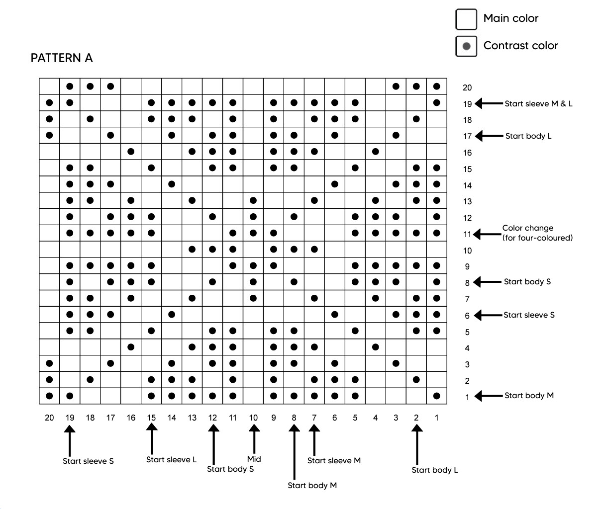 For the sleeve, I’m supposed to knit Pattern B then Pattern A. I’ve finished Pattern B, and starting on Pattern A, but if I follow the pattern starting at Row 19 and column 7 as indicated for size medium, once I reach the 70th round on the sleeve, I’m not ending on the same row as I did for the body. Body and sleeve are supposed to end on the same row.