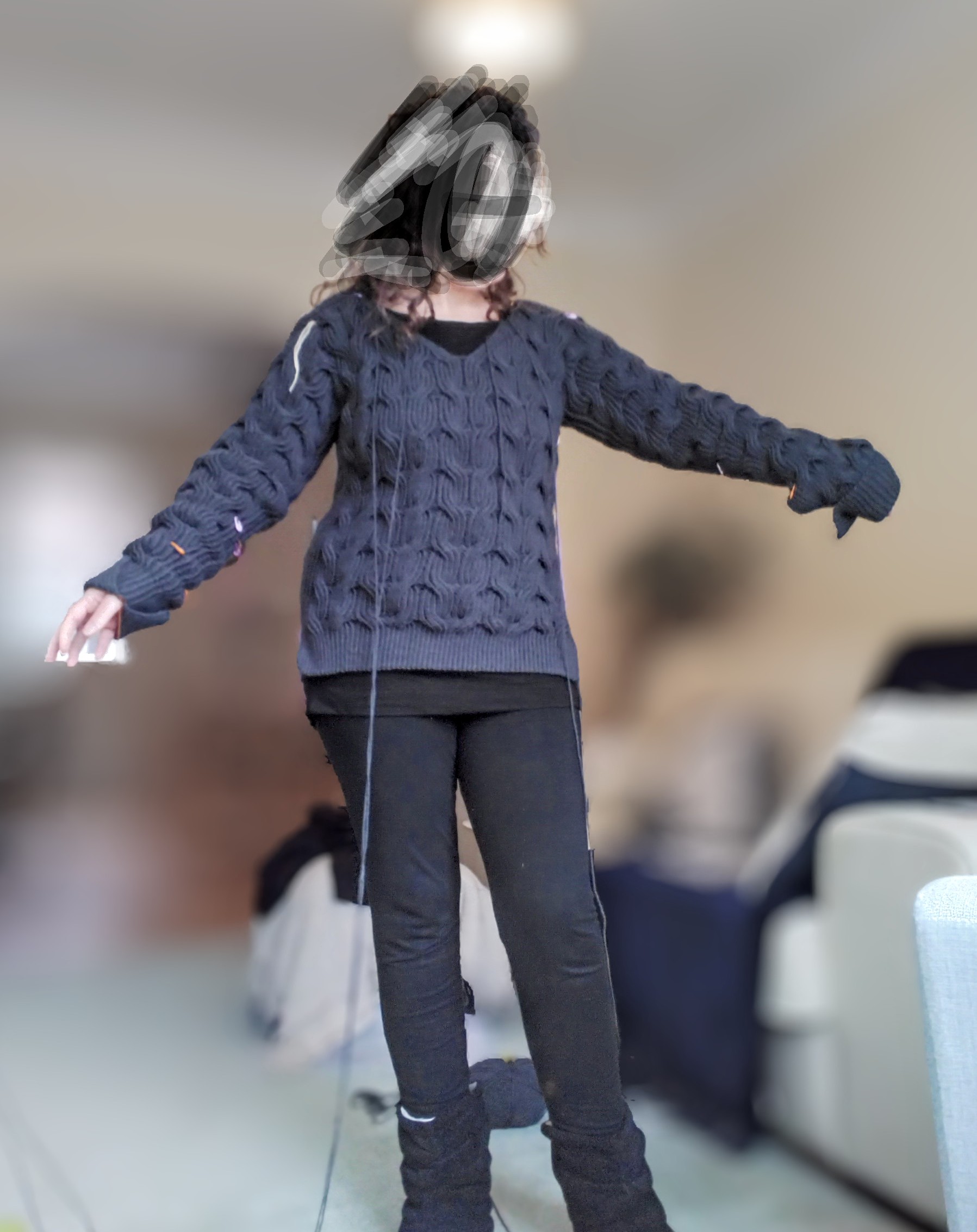 Full length to get an idea of overall fit. One sleeve is seamed, has a large fold back cuff, other not fully seamed. You can see here the v is not bad, it is not cleavage low but quite low, the top beneath is a wide scoop. I think this shows it has a modified drop shoulder, the last cable on the sleeve before the saddle sits a couple of cm below the shoulder tip. Didn’t want cable bulk on the shoulder.