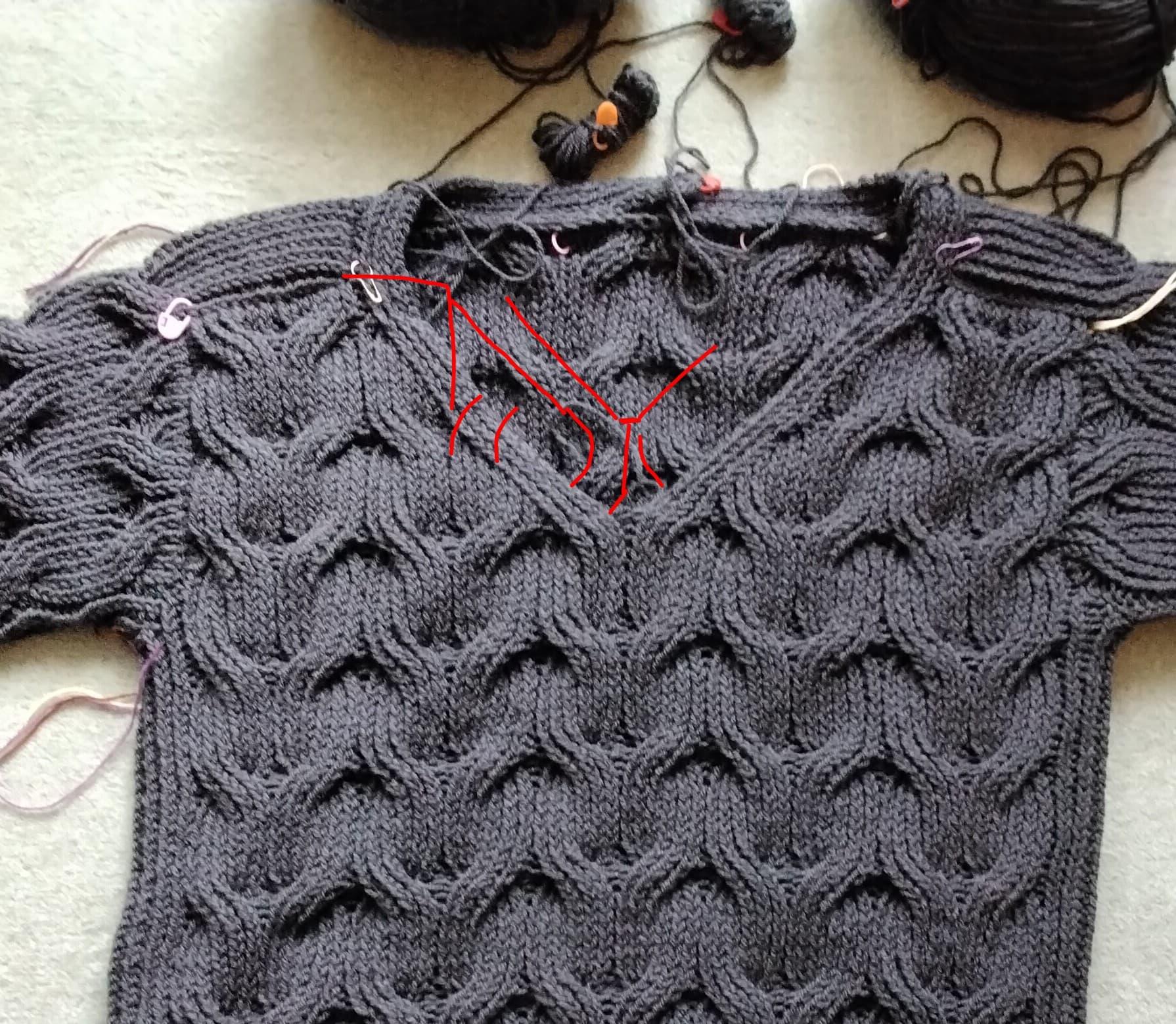 I think i just need to start the v one cable cross higher up. It was a bit 50/50 where I started that v anyway, I knew how I was going to decrease the cables and work the neckband but really didn’t know if lower or higher would be better.