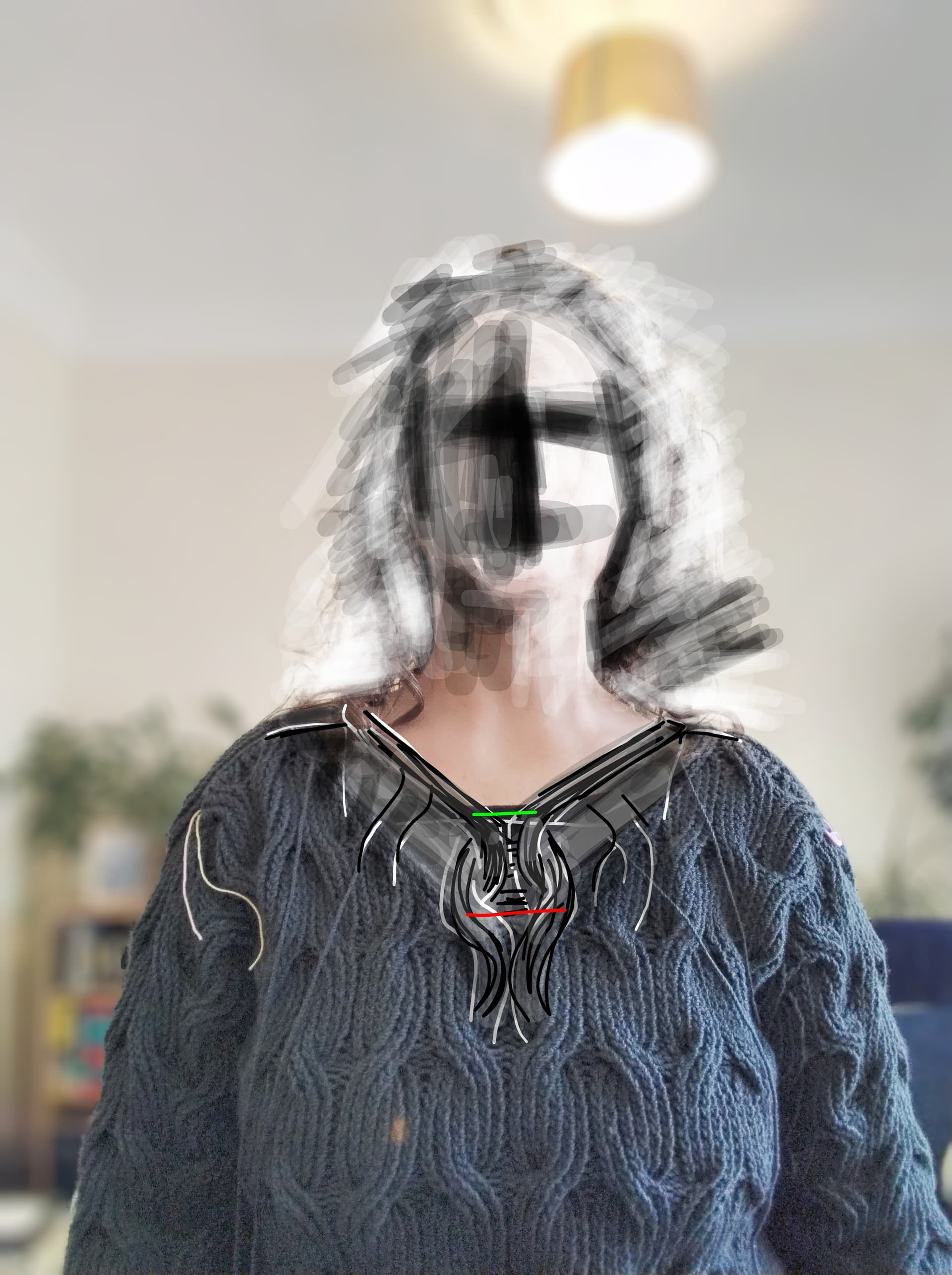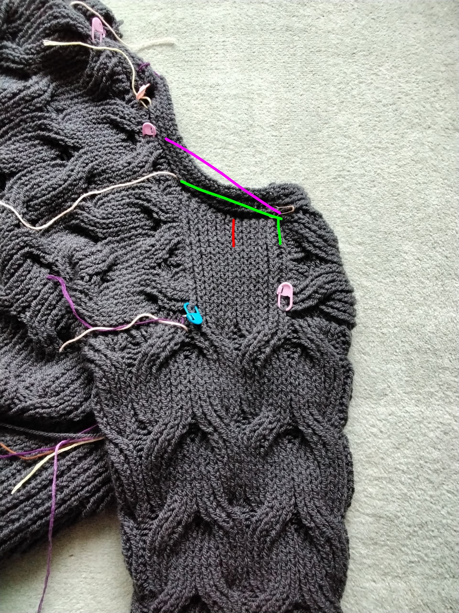 This is also a very bad angle it makes me and the sweater look larger than we are, quite frumpy (im no model but not quite as lumpy as this looks). But it’s the best i can do with my limited mobility and nowhere to lean my tablet on timer, anyway, I’ve scribbled on this to give an idea of a raised v neck. Red line is where it currently is and green is where it would move to which is about the level of the scoop top i am wearing underneath which is still quite low, its not as high as a regular tshirt or crew neck.