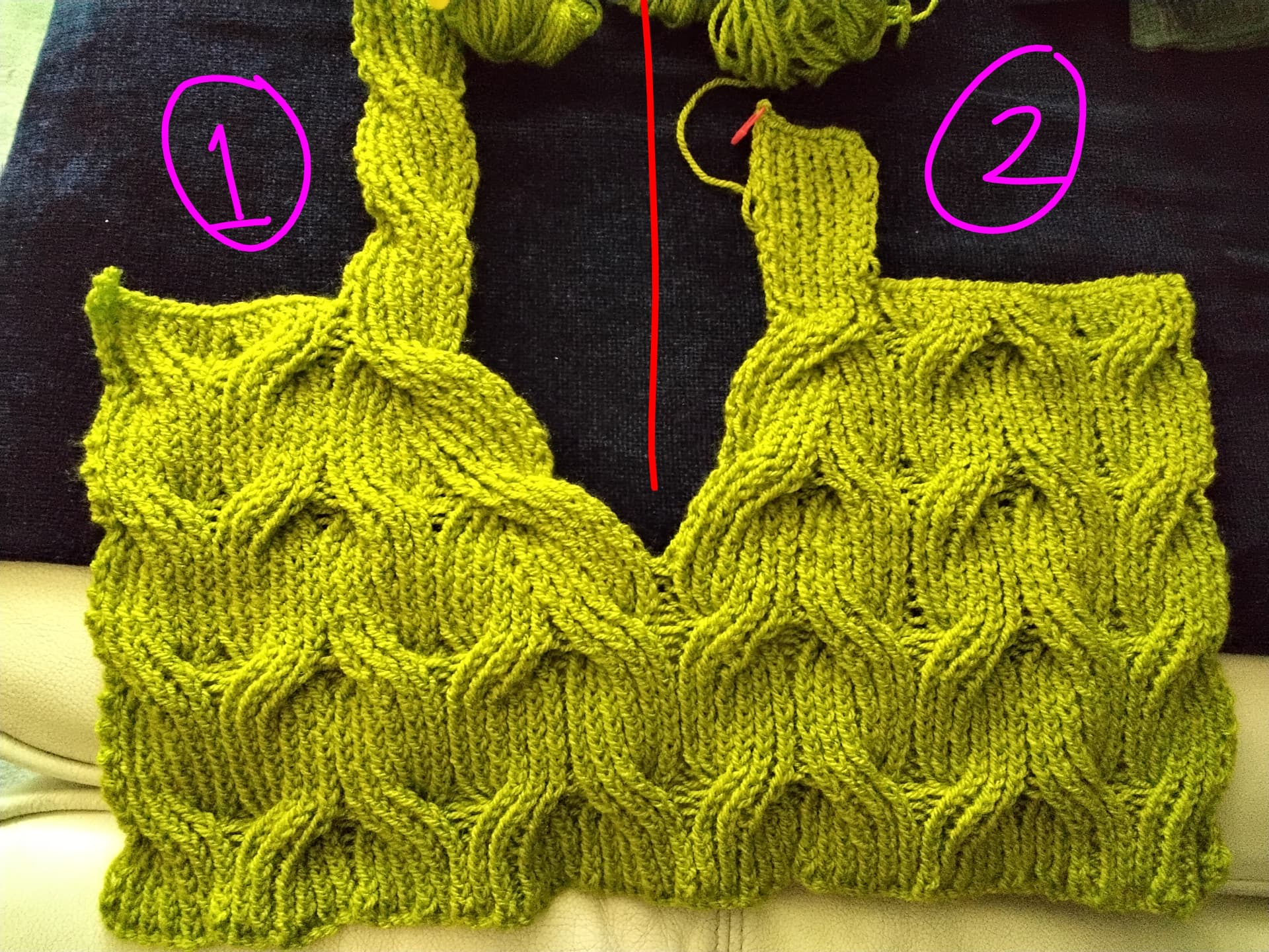 The V looks uneven because each side is worked differently so I’ve popped a red line in to try to show the centre. Obviously this is just a swatch, no saddles or sleeves.