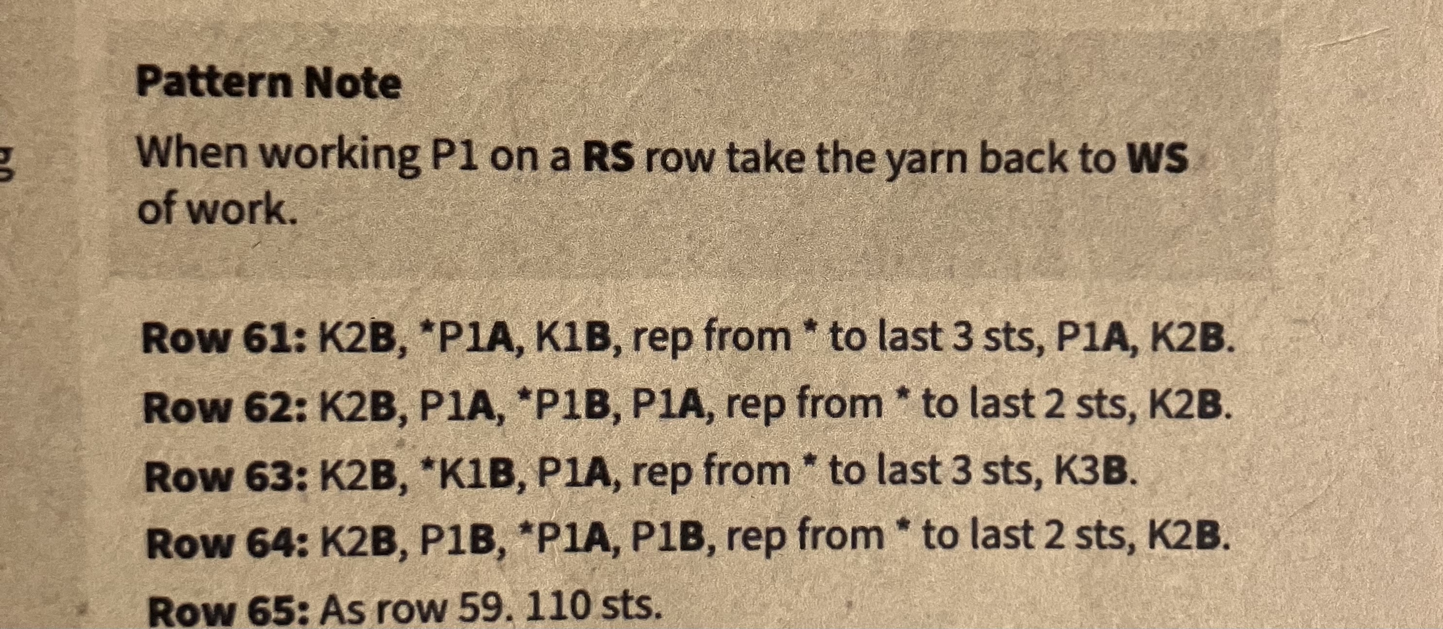 “[After] working P1 on a RS row, take the yarn back to the WS of work.”