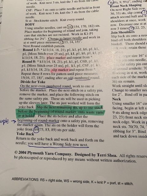 I have another question: the instructions for the Yoke back: see above - I am confused about how this works. am I knitting as usual in the round or am I working from the “wrong side” of the work? I have never seen this instruction. If I do this incorrectly, it looks like I will be knitting parts of the fabric together that should not be knit together. I have attached another image of the rest of that part of the instructions…The next set of instructions after that indicate that the Yoke front “with right sides facing” and beginning with a Right side row, work in pattern…am I making this more difficult than it has to be?