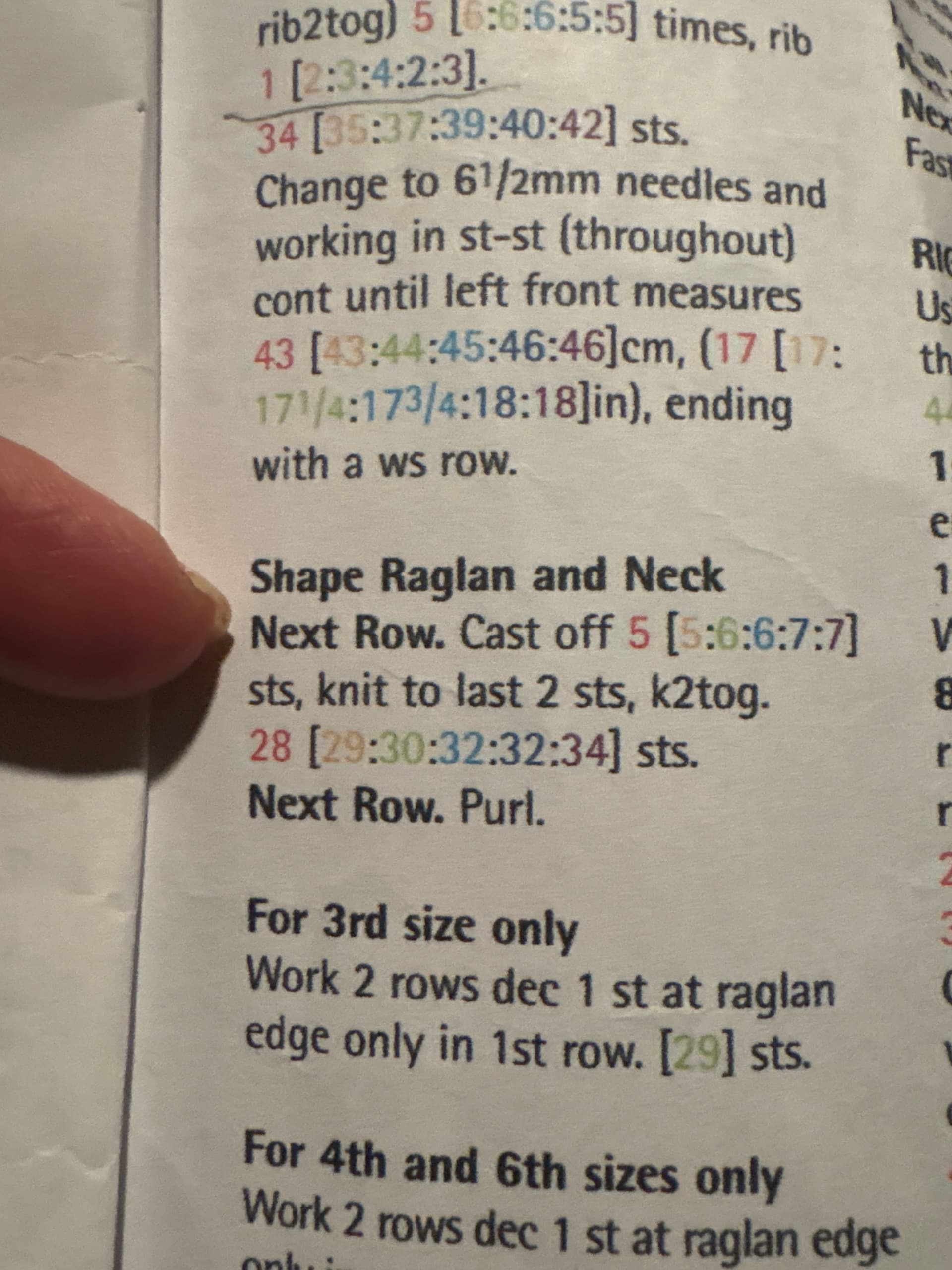 First sweater I have ever knitted my question is I am meeting the front left part of the sweater and I’ve almost got it 17 and three-quarter inches long and I will end with the wrong side row, this is what the directions says next I am a little confused