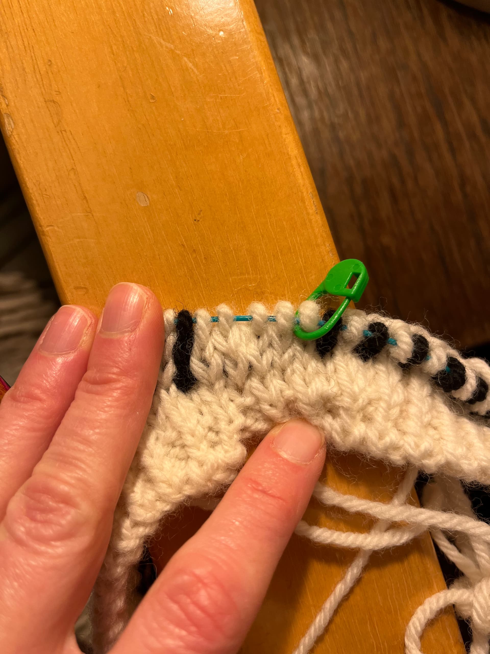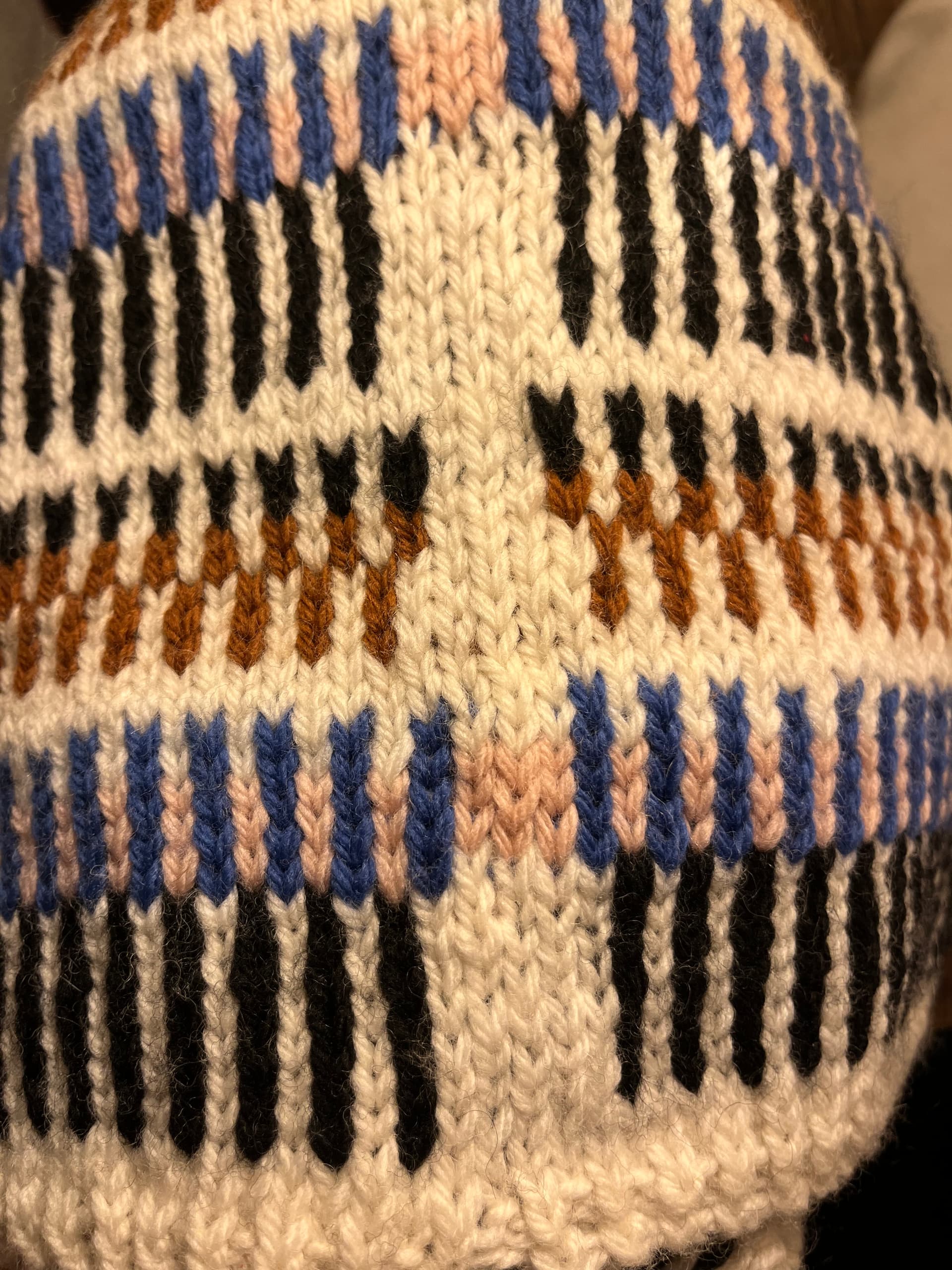 The other issue I have is tension: the fabric in the white vertical section at the end of rows always looks looser than the colour work section and the floats underneath show. I know that colour work knitting is tighter than single colour. I thought that simply tightening my yarn a bit would help but it doesn’t. Any other tricks im not aware of? Not sure that’s part of the problem but I also catch the floats in that white section, but maybe it’s not necessary considering it’s max 5st? Thanks!
