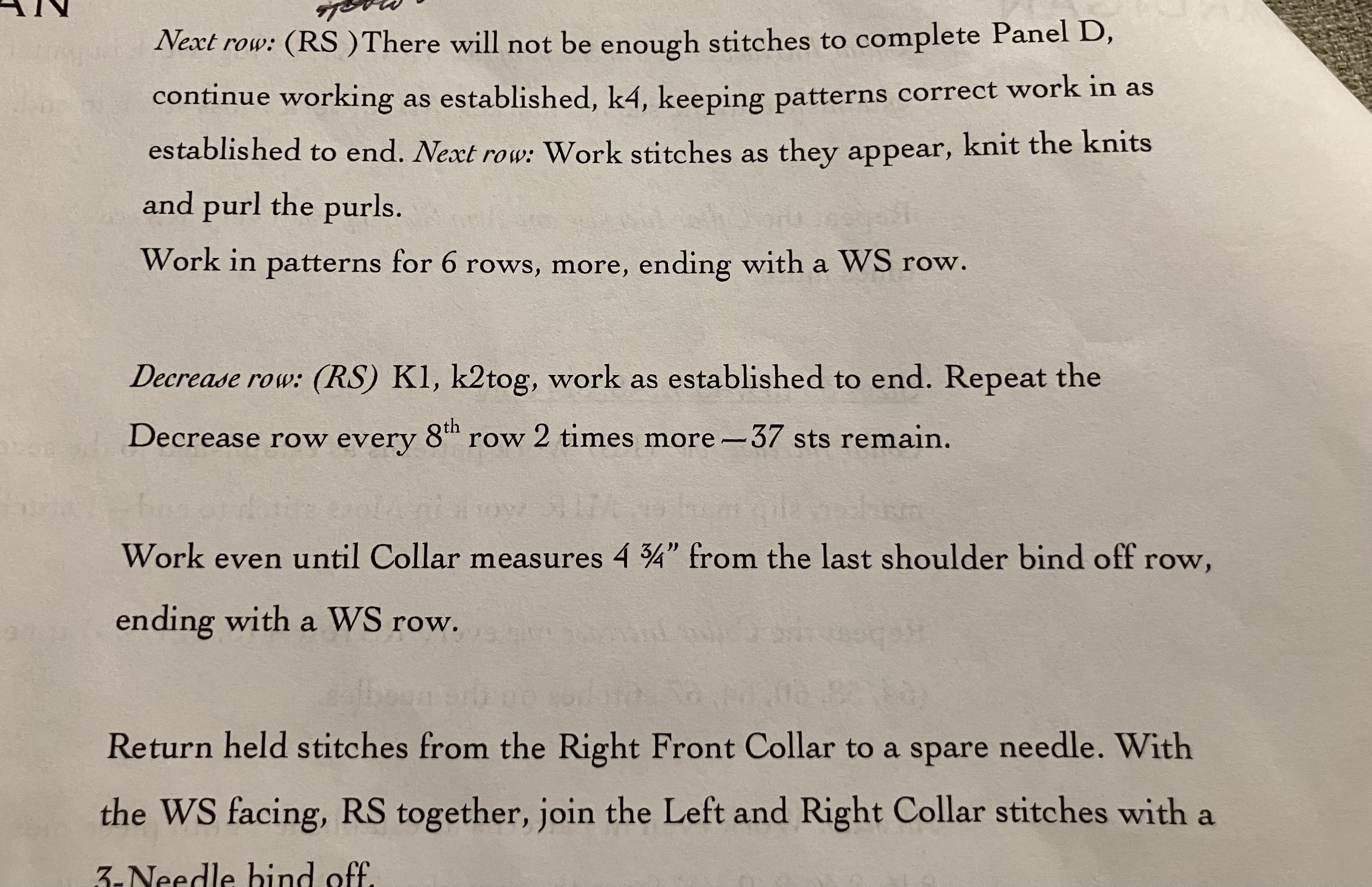 The next part reads - Collar Extension RS row, there will NOT be enough sts to complete Panel D, continue working as established, K4, keeping patterns correct work in as established to end.