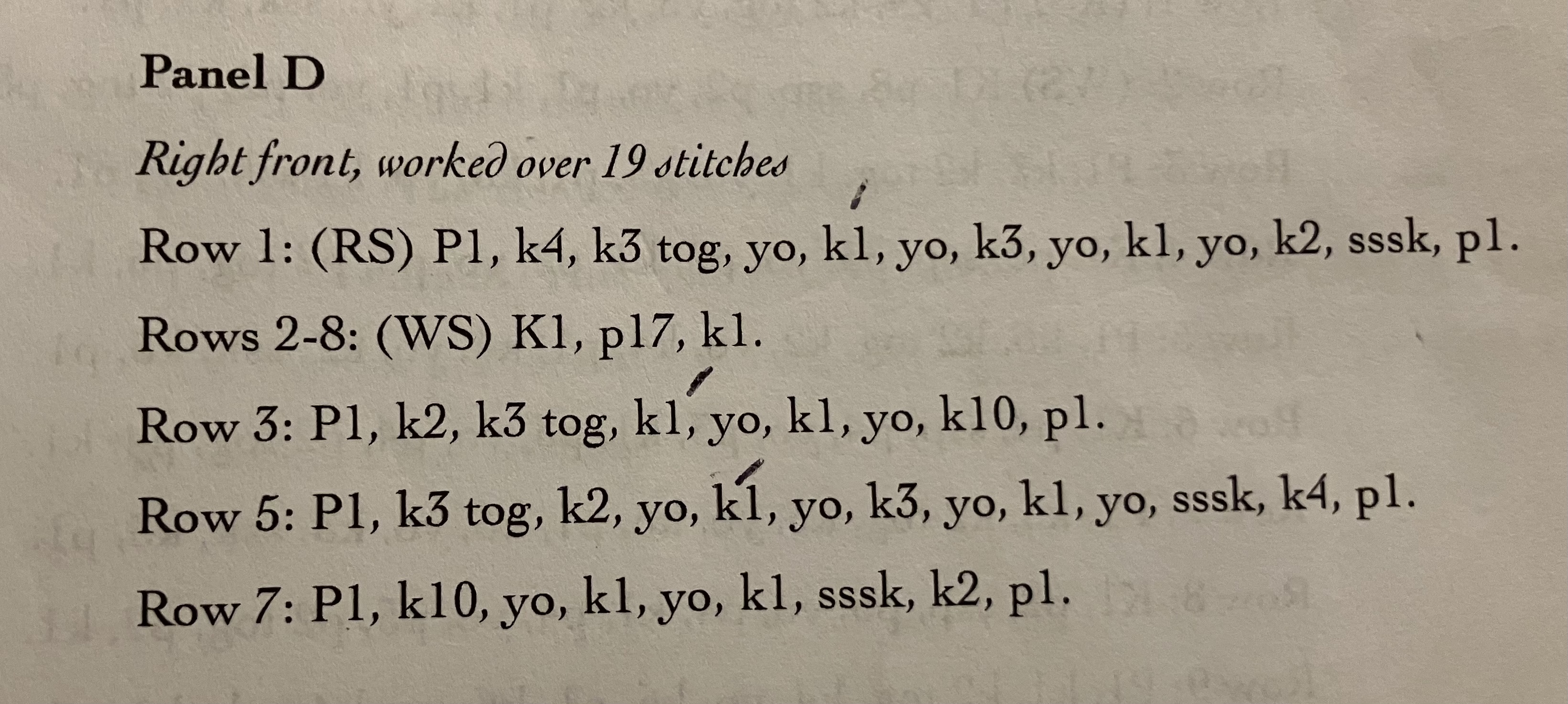 The pattern has moss stitch, a patterned stitch which would be PANEL D for now and that is followed by more moss stitch.