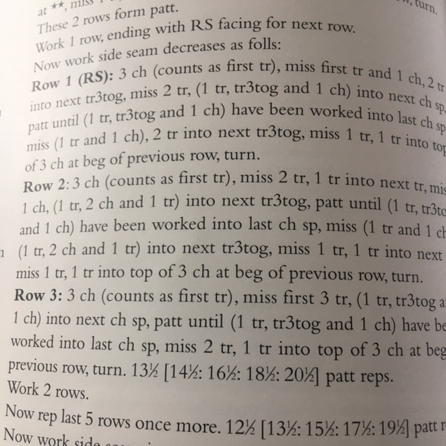 I am working the back and at the point where I am supposed to work side seam decreases. Pattern describes Rows 1, 2, 3 and then suggests pattern repeats. The previous pattern consisted of 2 rows. I am confused as to what the pattern is…Please see uploaded photo.
