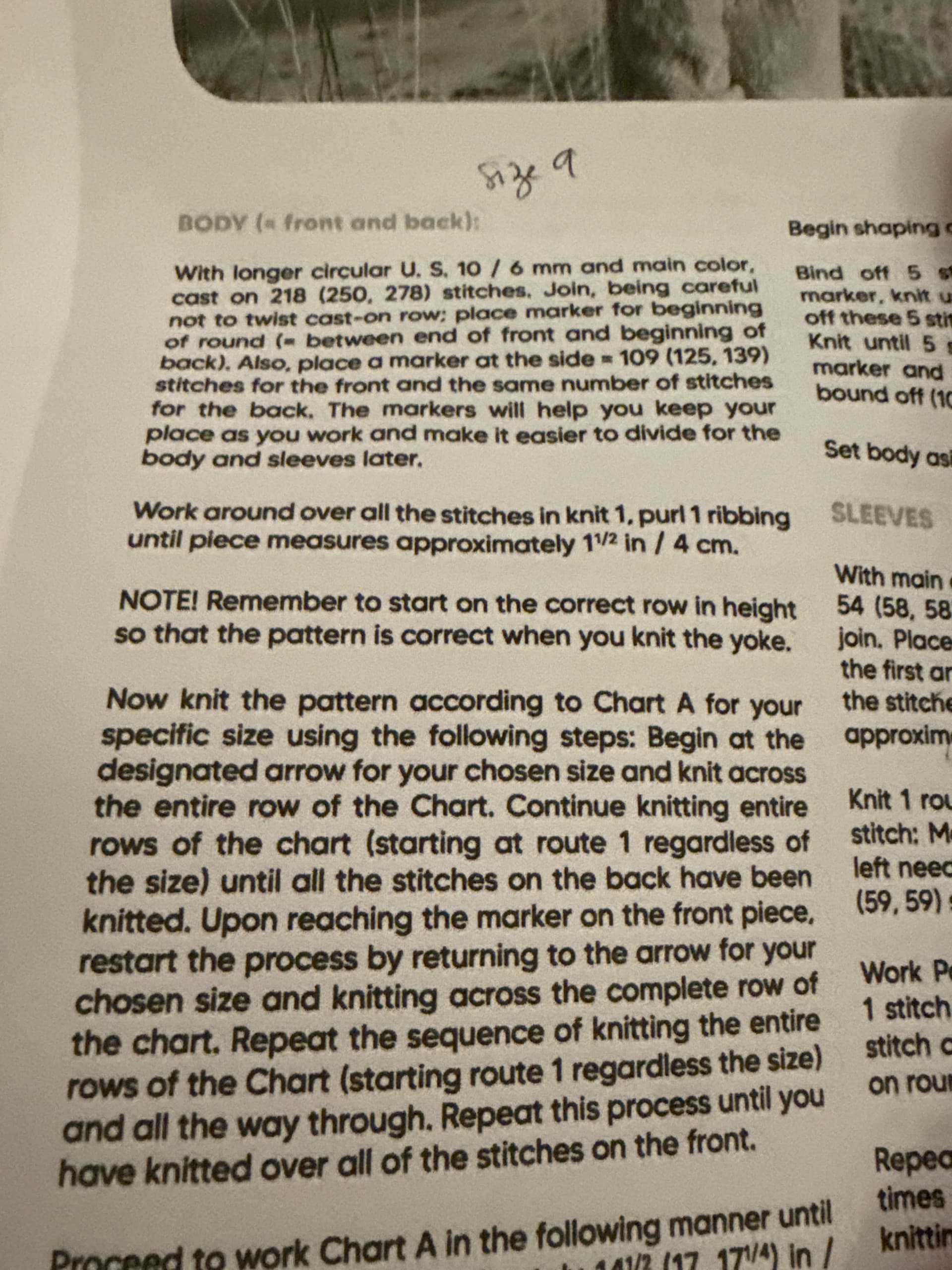 There’s also a note to remember to start knit at the correct row of the chart for your size.