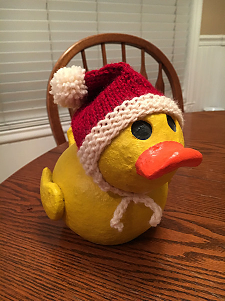 My friends thought I was nuts making a Santa hat for a ceramic duck, but he looks pretty cute! Ear flaps help hold it on.