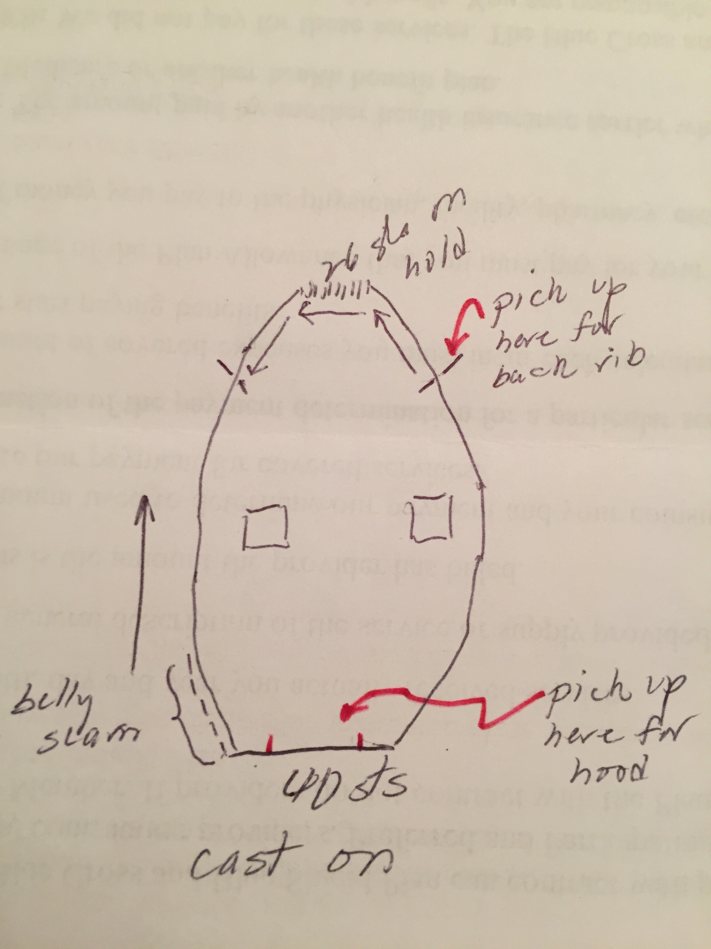 This is a simple diagram (not to scale) of the sweater showing the direction of knitting from bottom to top and the area to pick up sts for the hood in red.