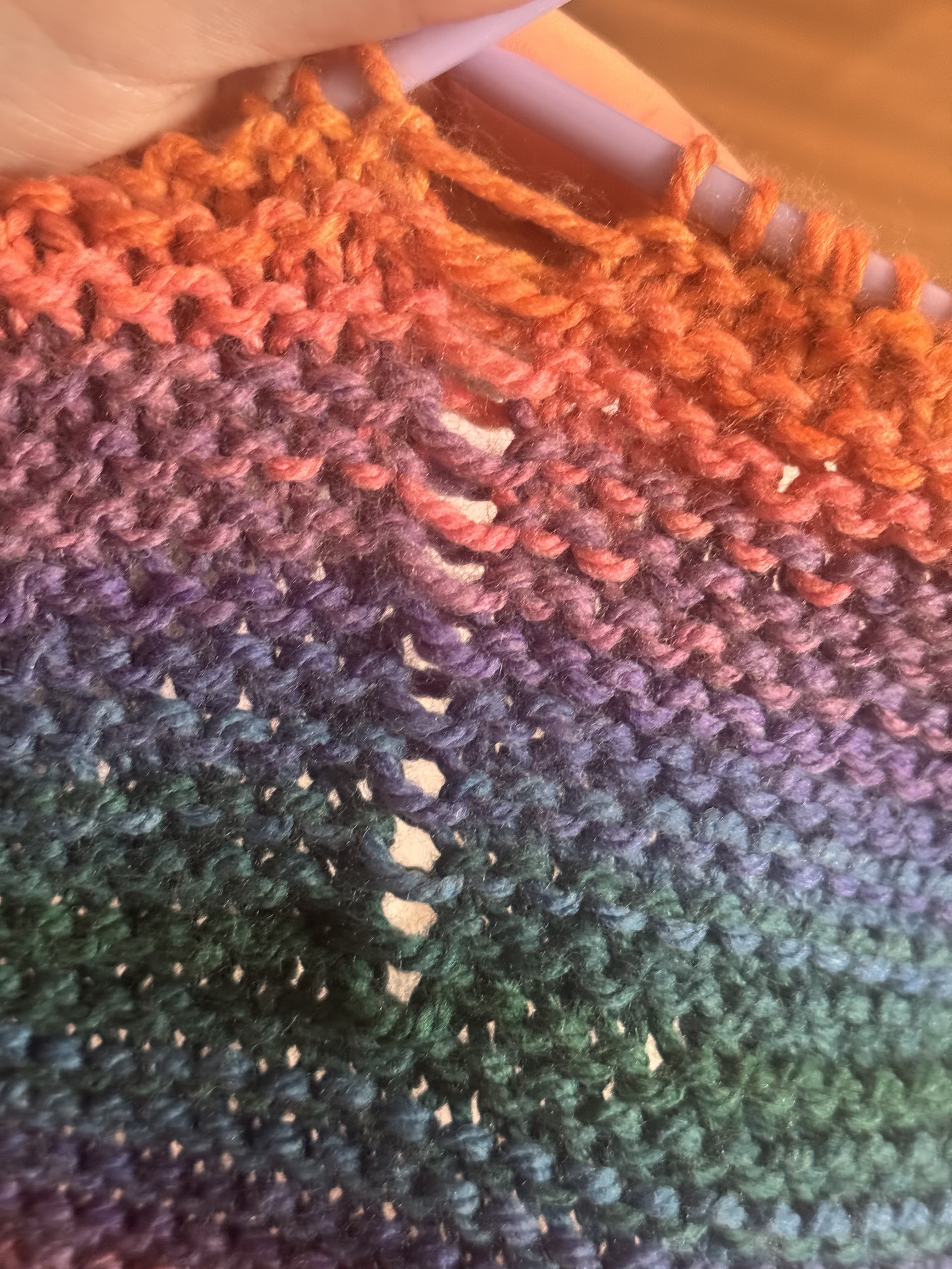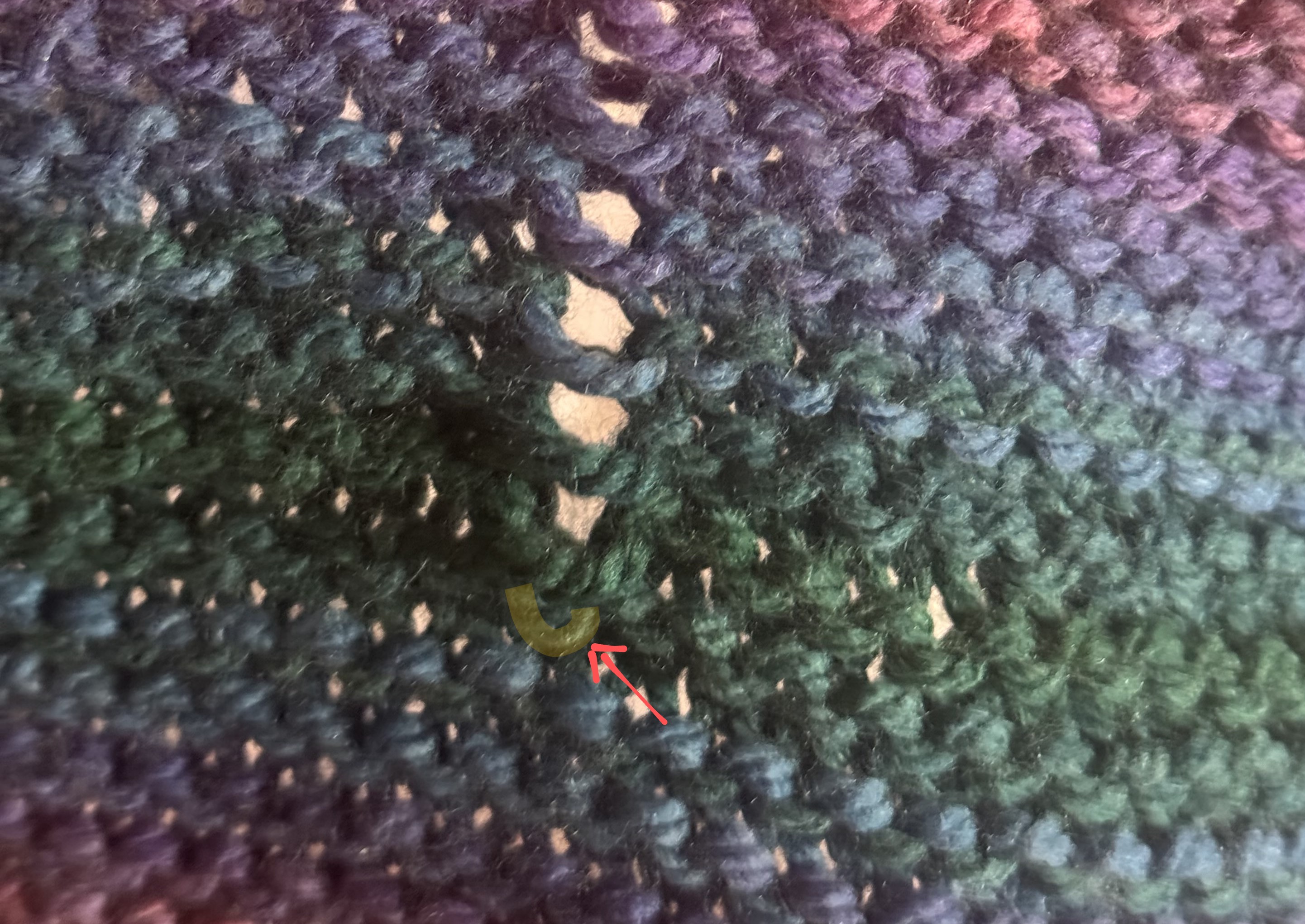 Hi all! I am brand new to knitting and doing my first project - a scarf. I am unsure of the technical terms but I believe I may have dropped a stitch, and I believe I’m knitting garter stitch? However I cannot see a ‘loop’ like videos/photos online show in order to fix it - does anyone have any advice on how to solve this sort of run in the knitting? Thank you!!