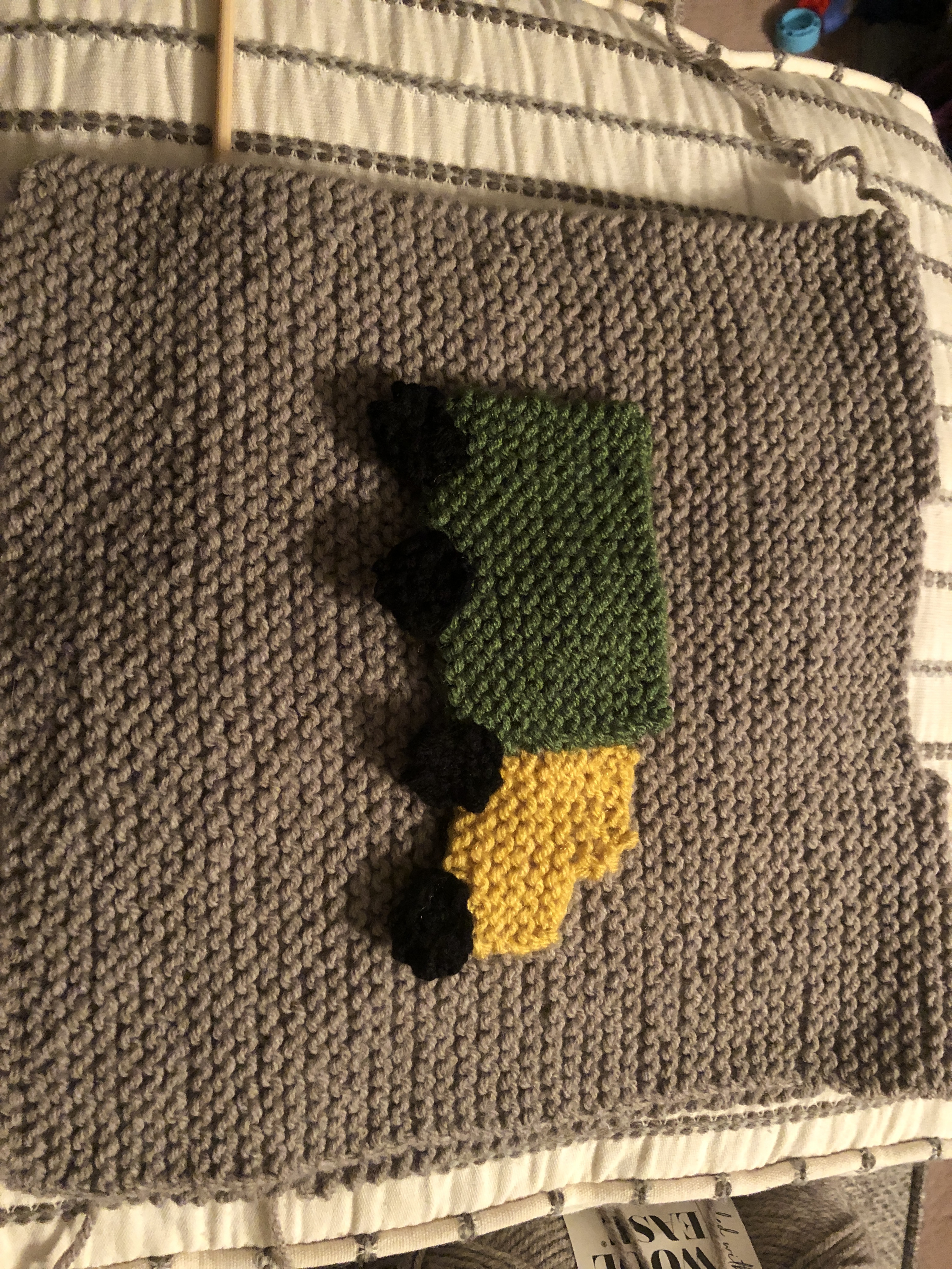 I suspect it would be easier to crochet the letter than to knit it. Although there’s this…I suspect they’re too large, but you could remove rows/stitches?