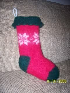 I was taking a fair isle class at a LYS and this is my finished product of the felted stocking (got the pattern from the class, but inserted my own fair isle pattern). Unfortunately, I washed it too long but it was just practice. Now I can knit two for my girls in the colors of their choice and hopefully not screw it up.