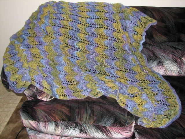 This is the Arctic Throw pattern knit in Berroco Air. Took me a month and a half, and this is going to be my sister’s birthday gift next week.