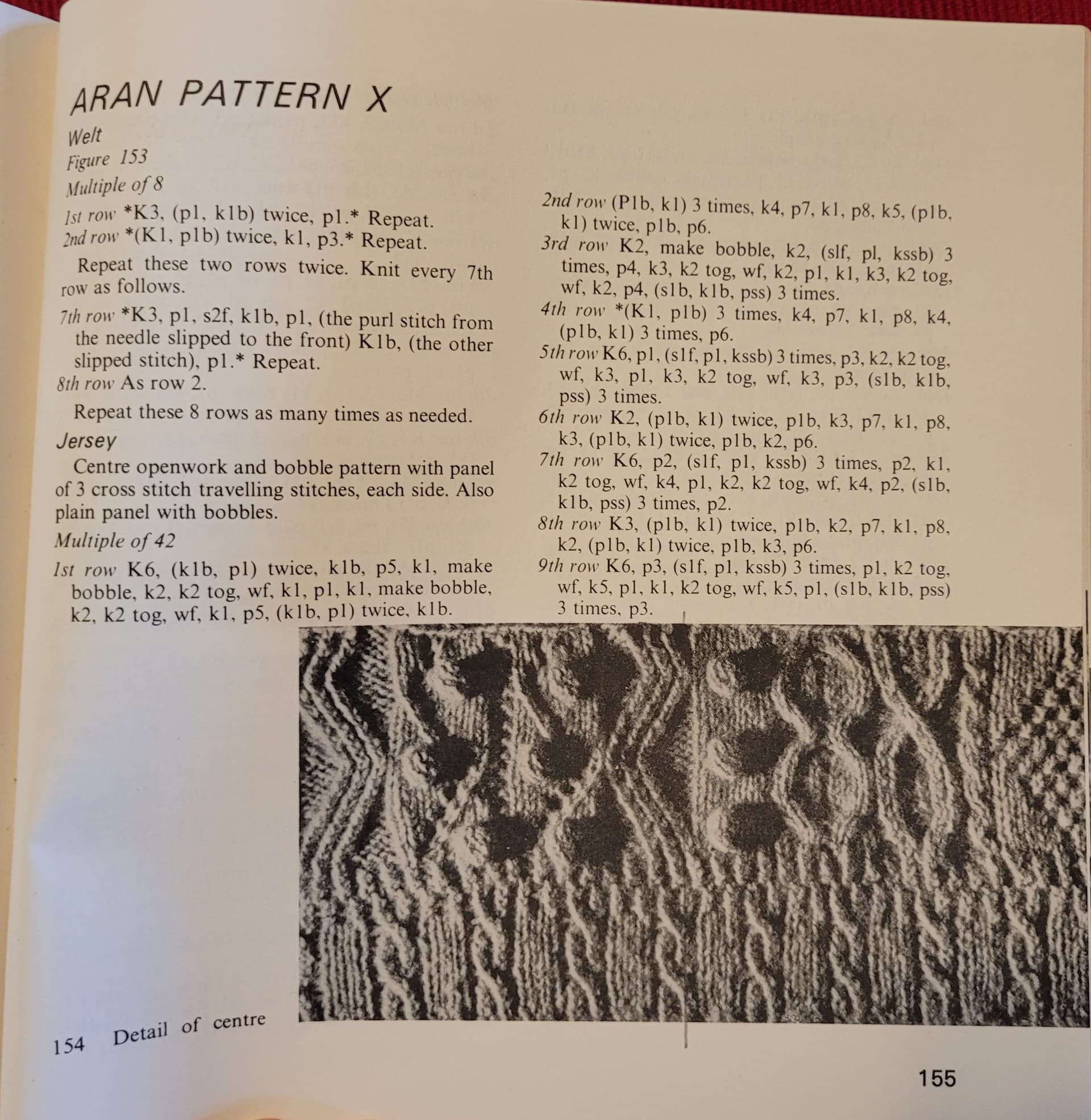 I bought the book PATTERNS FOR GUENSEYS, JERSEYS & ARANS by Gladys Thompson. I want to knit the ARAN PATTERN X on page 155. The instructions are for knitting in rows. I'm having trouble understanding the ribbing pattern (specifically the 5 stitches used for the cable).
