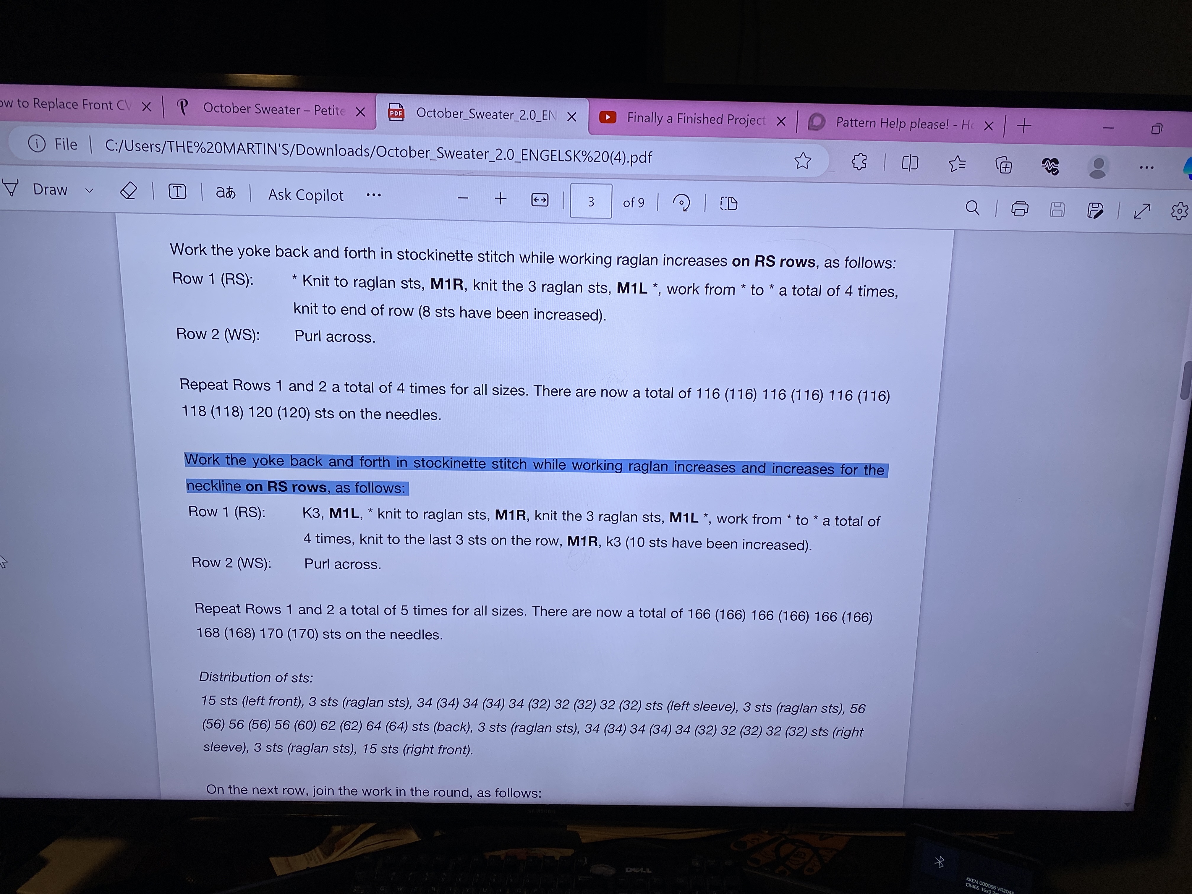 I am working a sweater pattern I am a newer knitter. Trying to understand what I need to if I should knit the stitch or do the increase. It says work the yoke back & forth in stockingnette stitch while working raglan increaseon RS rows as follows R1knit to raglansts,M1R,knit3 raglan sts,M1L but when I had to separate the raglan k1 pm left front,knit3 raglan sts, knit16 left sleeve knit3 raglan sts, Now am I suppose to put the m1r & then knit 3 plz help has anyone knit PK OCT Sweater pattern
