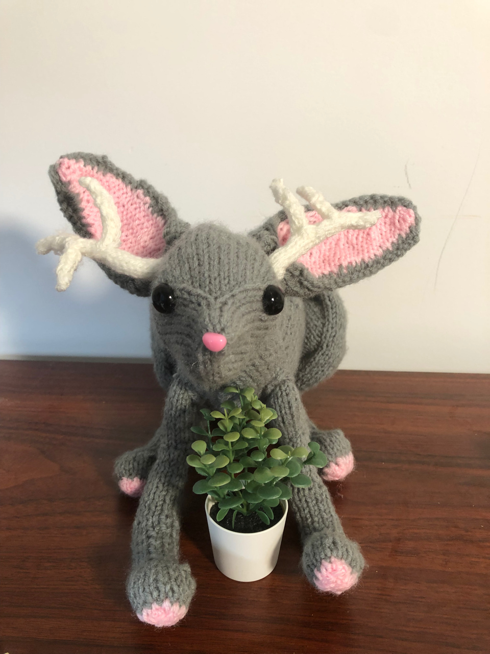 The pattern is Ravelry: Jackalope (AKA Antelabbit or Stagbunny) pattern by Hansi Singh