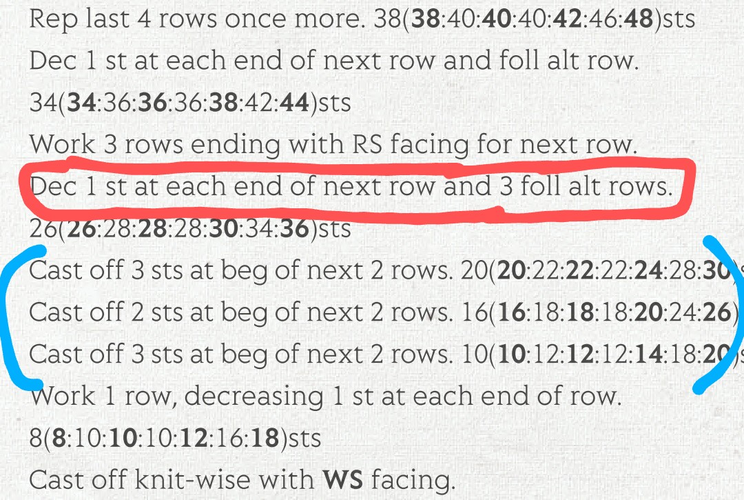 I’m most of the way through making my first jumper and this is part of the pattern towards the top of my sleeve. I’ve been struggling with exactly what the part in red means. Does it mean I should work the first decrease row then 6 more rows decreasing on each alternate row? Or should I continue working the rows in blue including my decreases there. It’s the only part of the pattern that’s worded this way and I find it very unclear. Don’t want to end up 6 rows out in any direction.