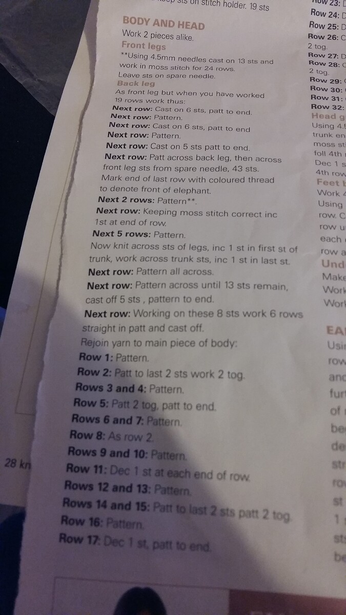I’m currently knitting an elephant shaped toy in moss stitch for a new arrival in the family and am perplexed by a particular section of the pattern.
