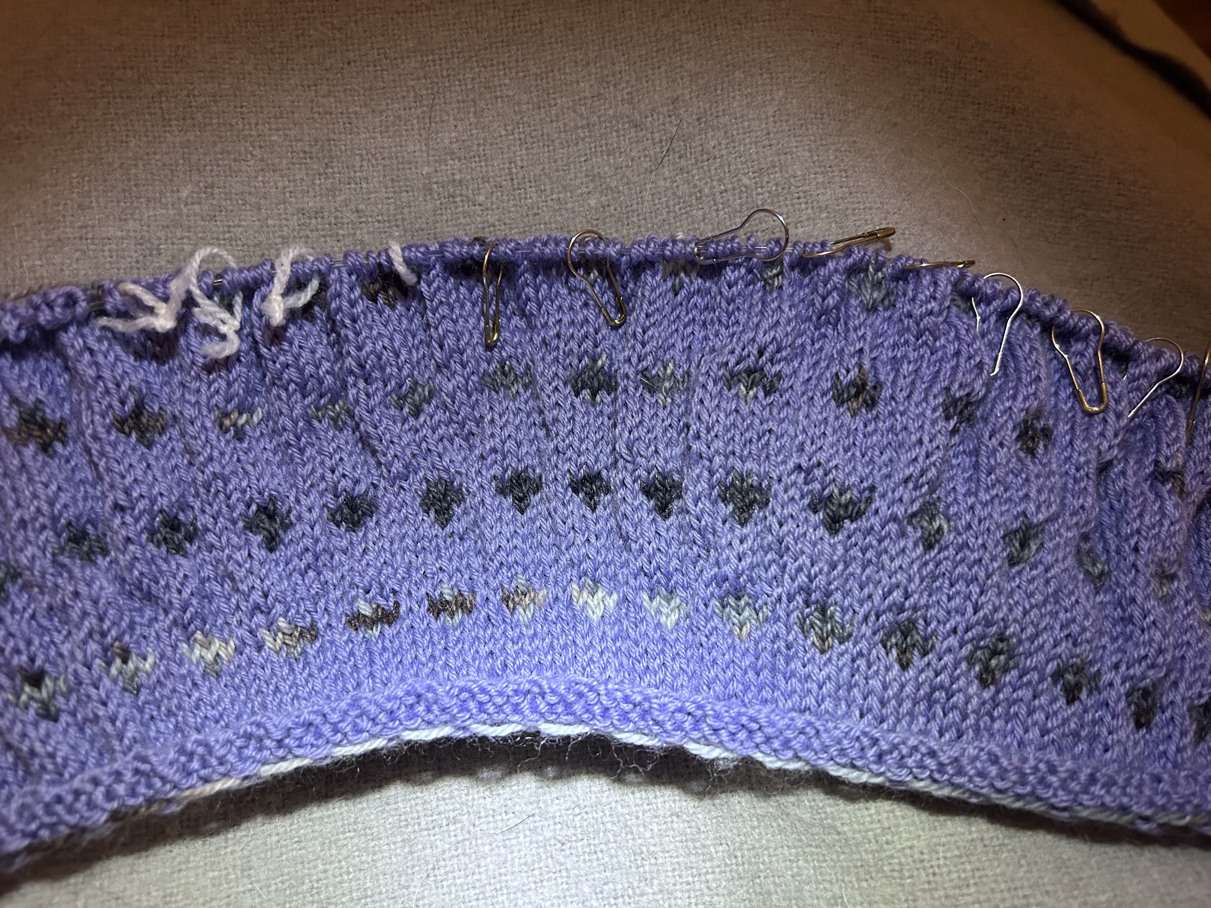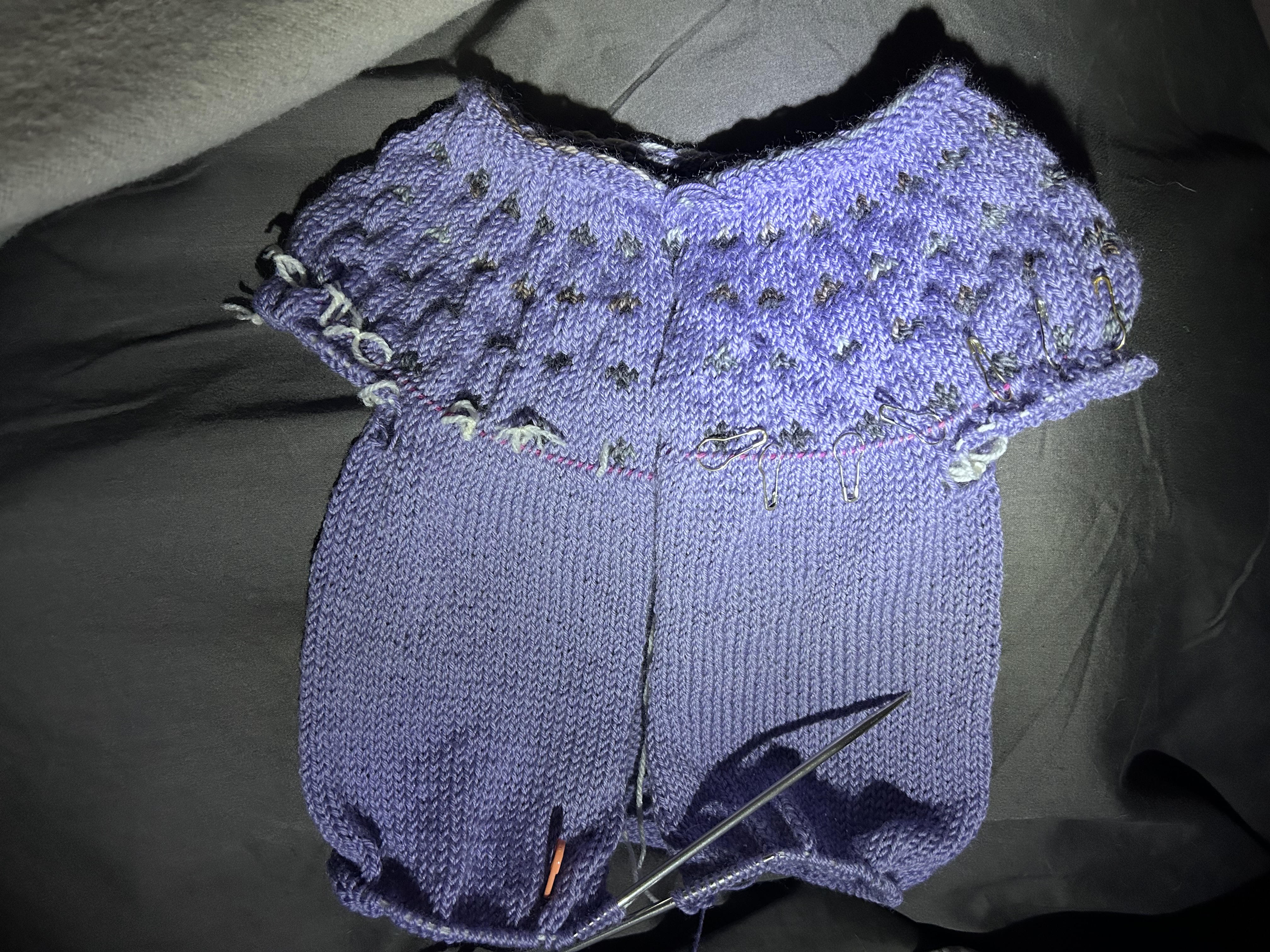 Setup Rnd: With MC, k to end of Body sts, pm, without breaking yarn, starting at bottom right front corner, pm, pu and k2 sts for every 3 rows up Right Front approx. 60 sts, pm, pu and k77 sts across top of neck (do not pu into first or last st of neck c/o), pm, pu and k2 sts for every 3 rows down Left Front, making sure to match the number picked up on Right Front. Pm to mark beg of rnd and join to work in rnd. Approx 333 sts total.