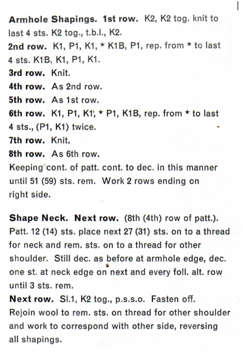 For these 12sts, dec one at the neck edge on the next row and then every other row. At the same time, continue to dec at the armhole edge.