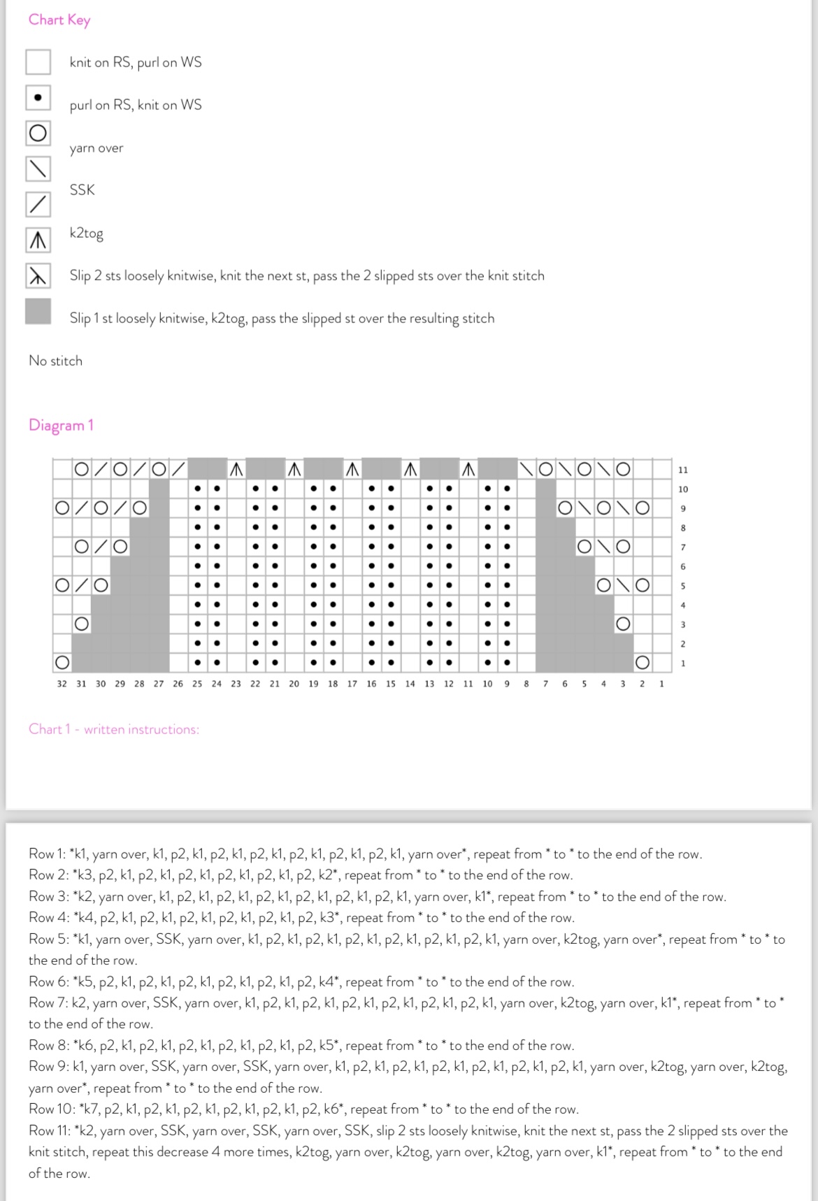You’re absolute right, the chart key is out of alignment and it was completely throwing me. I was reading the grey squares as being slip 1 kw, k2tog…etc and that’s why it wasn’t making any sense. Thanks so much for your help ![]()