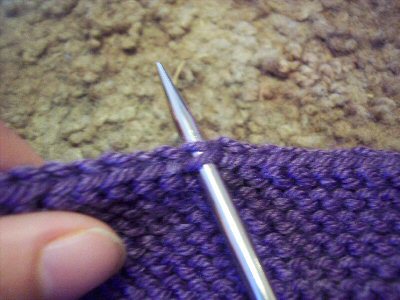 This is the edge of a knit row, where I slip the first and purl the last stitch. Notice the larger “hole”, it makes it easy to see where to put your needle.