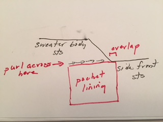 This video is similar to your pattern. The front sts for the pocket are cast off where your sts are on hold but the idea of substituting the pocket lining for the pocket front sts is similar.
