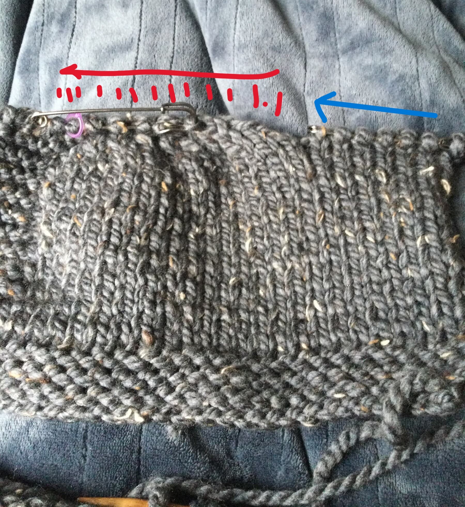 Knit across the to the held sts on the front (blue line) then, instead of completing the row on those front sts, knit across the held sts for the pocket liner (red lines). The pocket lining can sit in back of the front sts if you want a visual of the eventual pocket.