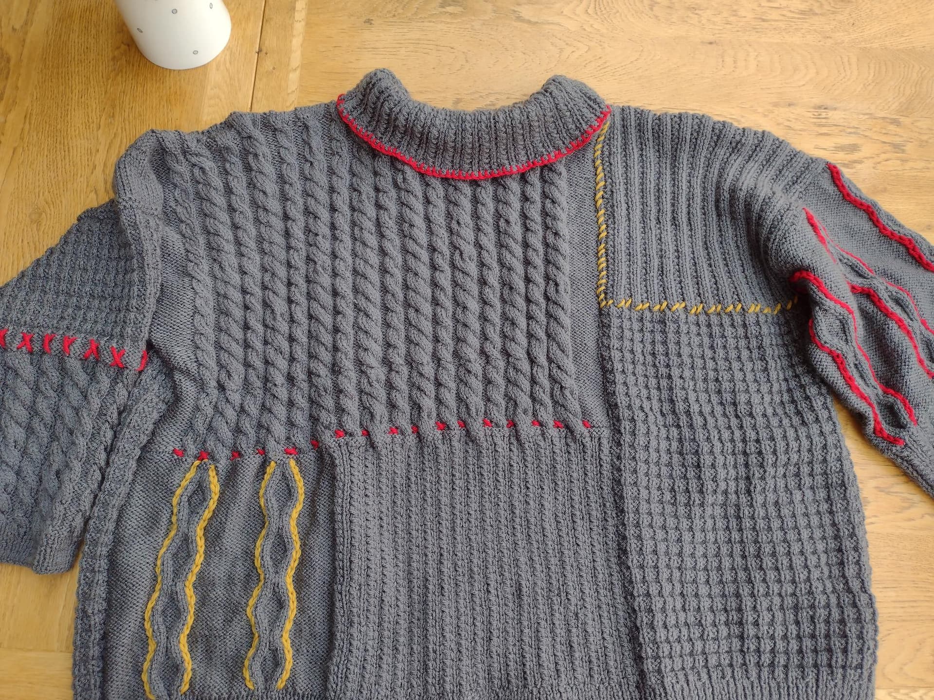 Interested and delighted. Your sweater is so nicely done, beautiful knitting and embroidery. Enjoy wearing it!