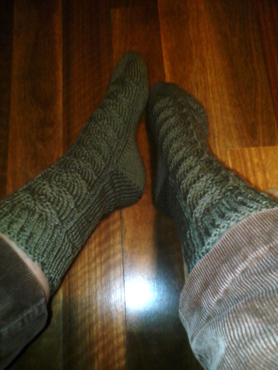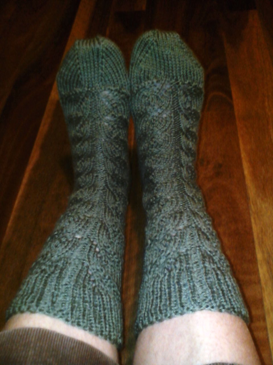 she… "Did ‘Drawn-work’ stitch pattern from Freeknitstitches on instep and front of leg with some ribbing on back of leg. "