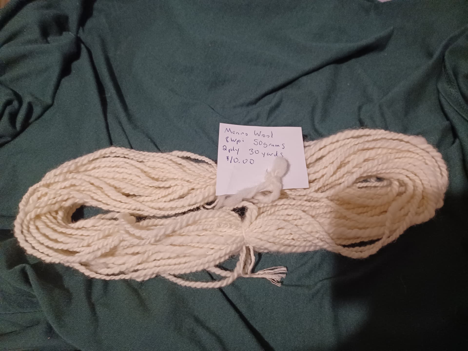 2 ply, merino wool, it finished at 8 wpi, measured at little more than 24 yards.