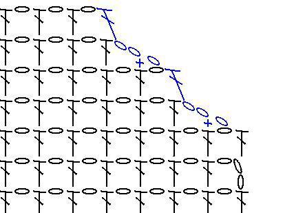 Here is a drawing I made using crochet symbols. It shows how the decrease would look over two rows.