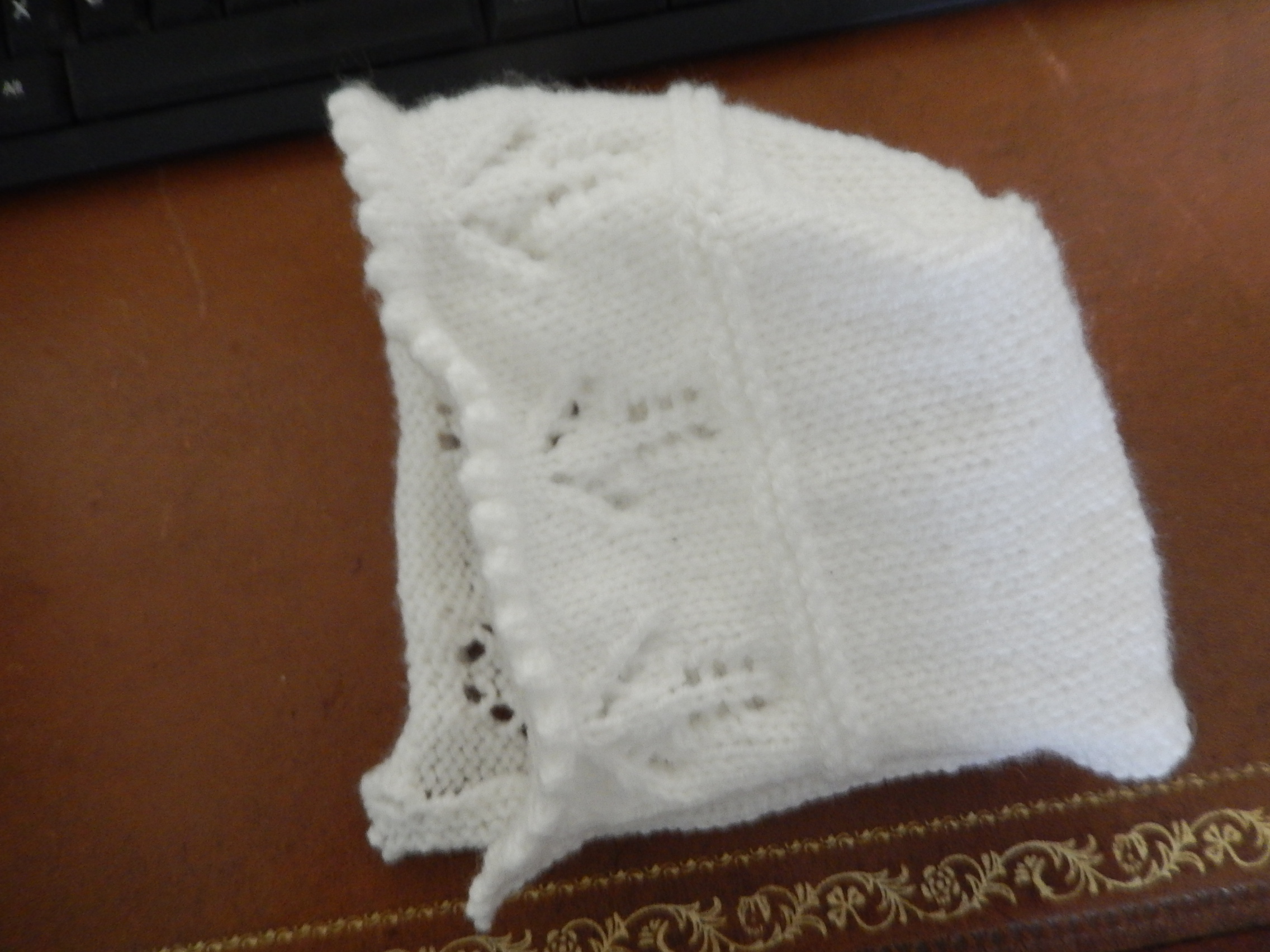 A triumph! The bonnet is lovely and either ribbons or the knit ties (maybe i-cord) will work well.