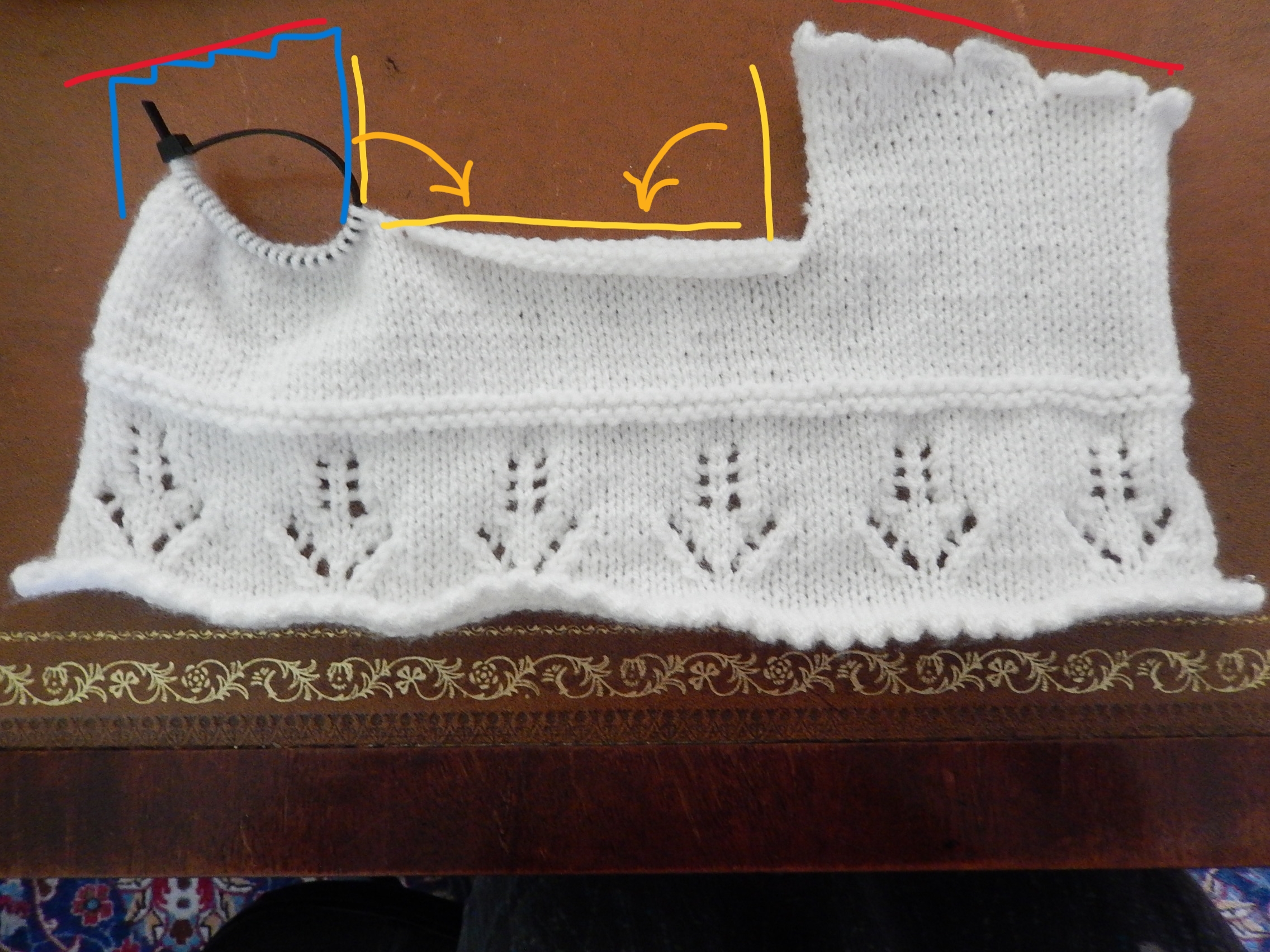 At this point the pick up for the neckband will make more sense. Start at the side of the picot edge and pick up sts along to the back seam, then continue picking up sts to the other side ending at the picot edge. You’ll have sts along the neck edge of the bonnet from one side of the front to the other.