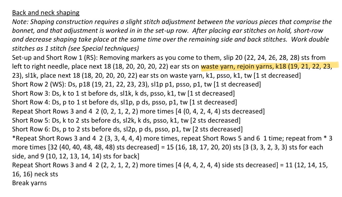 The next 18sts go on hold for ear #1. Youāll need to cut the yarn attached to the right hand needle and begin the next step with a new end of yarn to knit across the next 18sts toward ear #2.