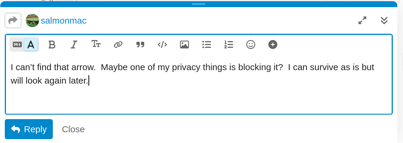 I don’t have preview available. The attachment to salmonmac’s post includes the bottom of the reply box then and it’s the same now. I would like to have preview so if Sheldon has the time to look at it that would be nice. I might try a different browser tomorrow. For now I’ve cleared cache, closed and restarted Firefox, and now I’ve restarted the computer. I think I’ll go to bed now. lol