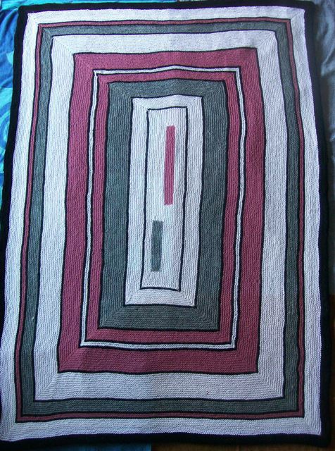 I like a folded hem, so the last section of black is knit extra wide, with increases, and then decreases on the second half. I then grafted the last row on the reverse side to keep it stretchy like the rest of the blanket. This took a long time, but I like the result very much.
