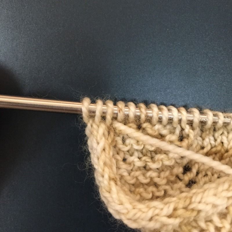 Here is the final view of the RS, after I’ve knit the first 3 stitches for the icord. You can see the bar running across the icord.