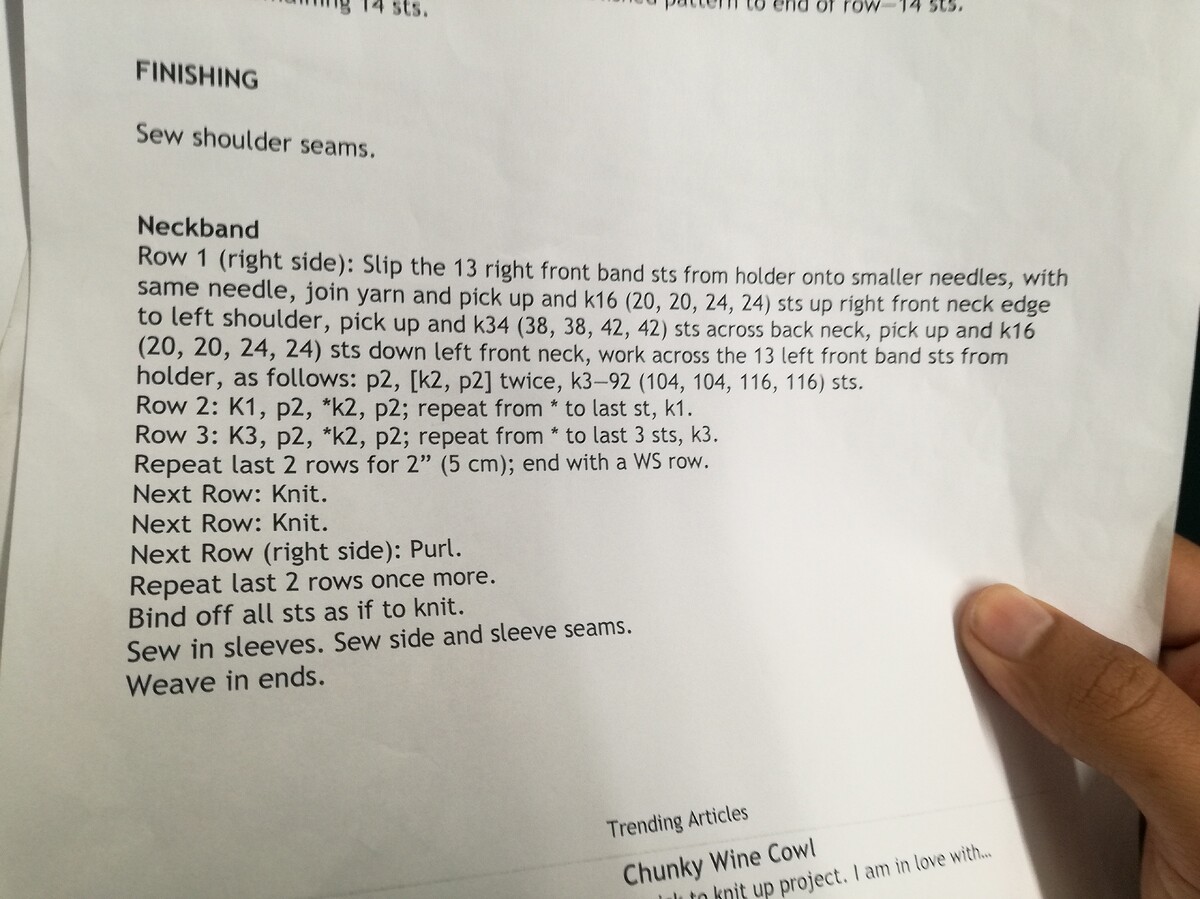When you finish the shoulder, it’ll be easier to see how to put the 13 front band sts onto a needle, join new yarn and pick up sts.