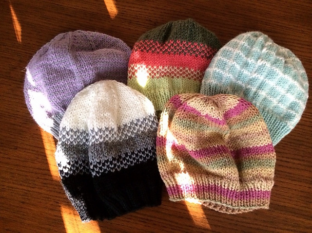 I’ve done the one like Golden Pear several times, but didn’t use a pattern. Here’s a couple of them in this picture. It’s as simple as alternating colors on each stitch. You won’t need to do anything fancy across the back. Don’t pull the stitches too tight. Sometimes fair isle can pull in a little and slightly distort the hat.