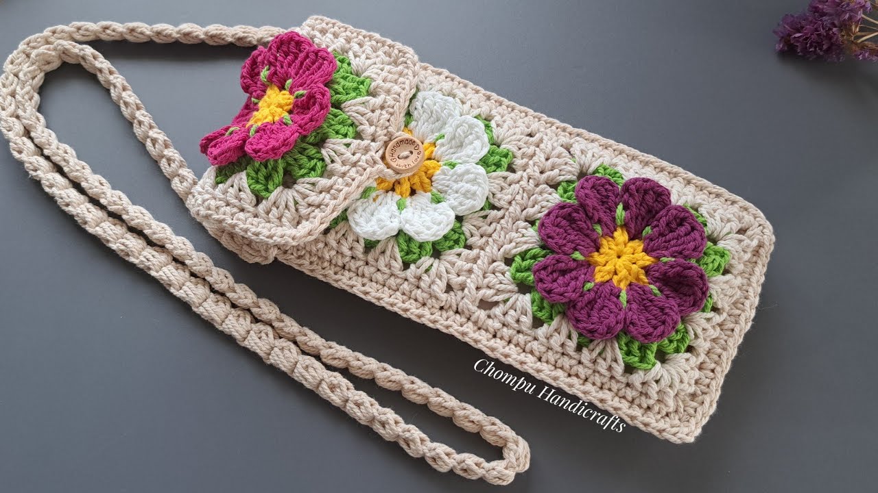 How to Crochet Flower Granny Square Phone Bag | Chompu Handicrafts