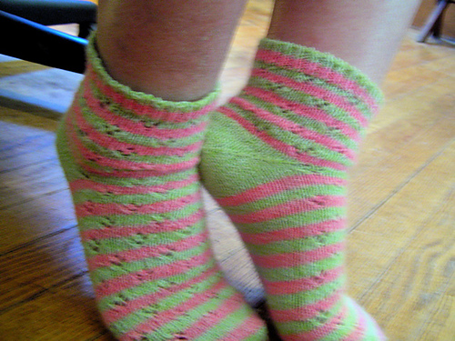 Lest y’all think I’m some kind of sock-knitting guru, I had just about finished the heels, realized they weren’t fitting right, and discovered I’d neglected to rearrange the stitches. So I was using half the stitches instead of 60% or so. Rip, rip, rip. This was the first time I’ve ripped back socks the “thrilling” way: pulling the needles out! But the wool was nice and grabby, so the tiny loops just sat there for me to pick up. :woot: Here’s where I’m at: