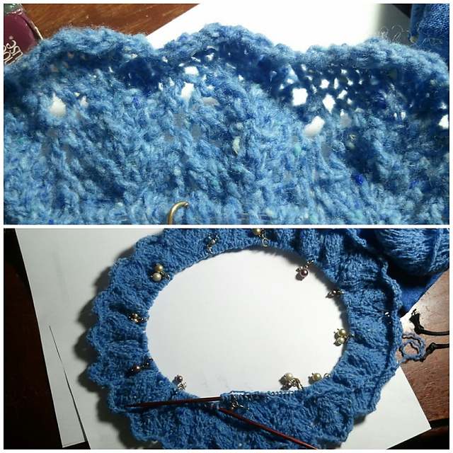 The sweater was already this lovely blue. I’m hurrying to make this top to wear with a nice skirt I just bought. Hope I don’t screw this up. I decided to knit it at a looser gauge. I did the math and found I must knit a smaller size than I normally would. This is bottom up, so after I get a few more inches done, I’ll try it around my hips and make sure I’m in the ballpark. I’m making this top longer than the one modeled in the pattern.