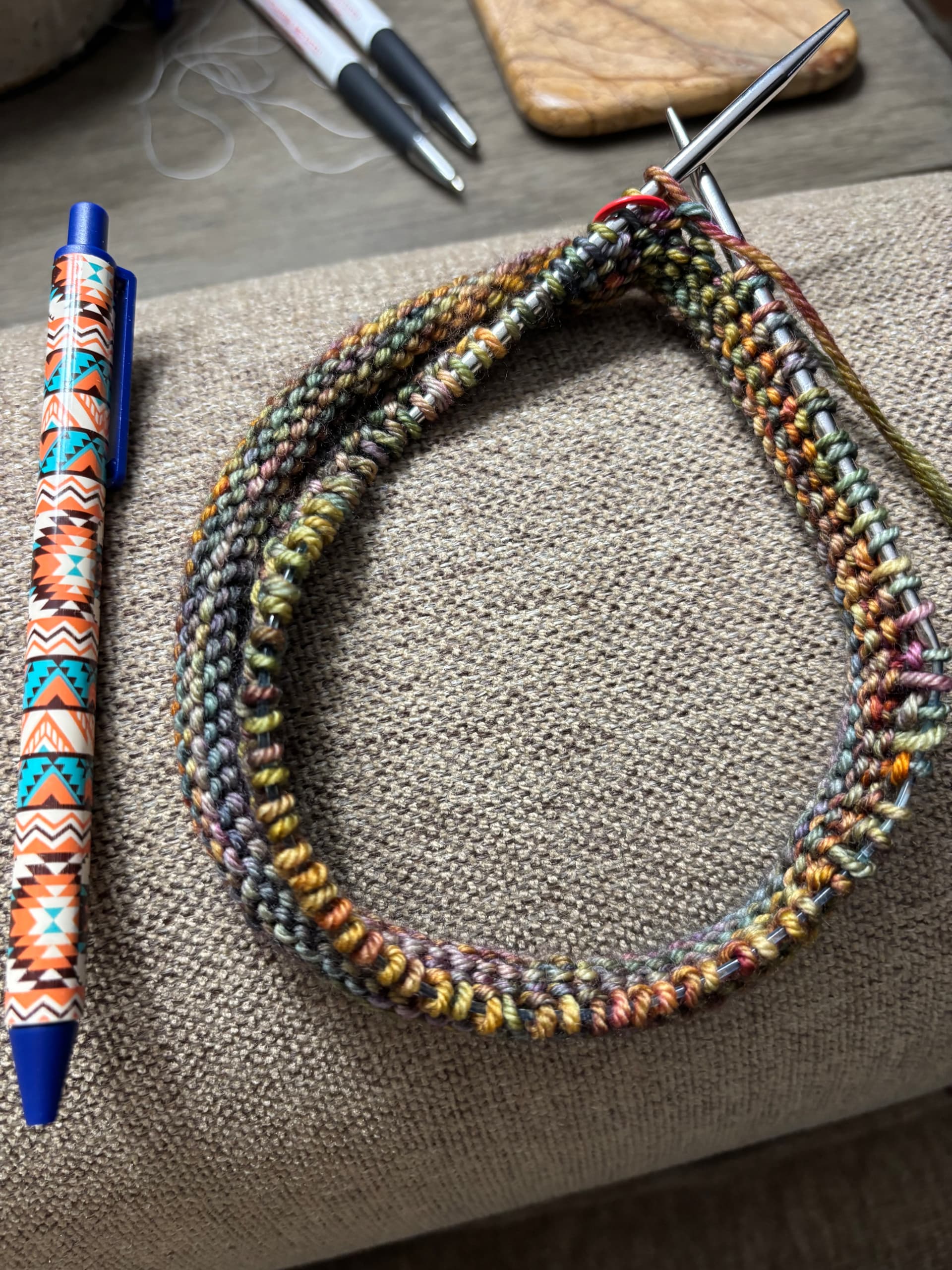 Linen stitch is lovely but worth swatching in that pattern as it can be tight. You can work a couple more rounds to see how it goes if you think it’ll help.