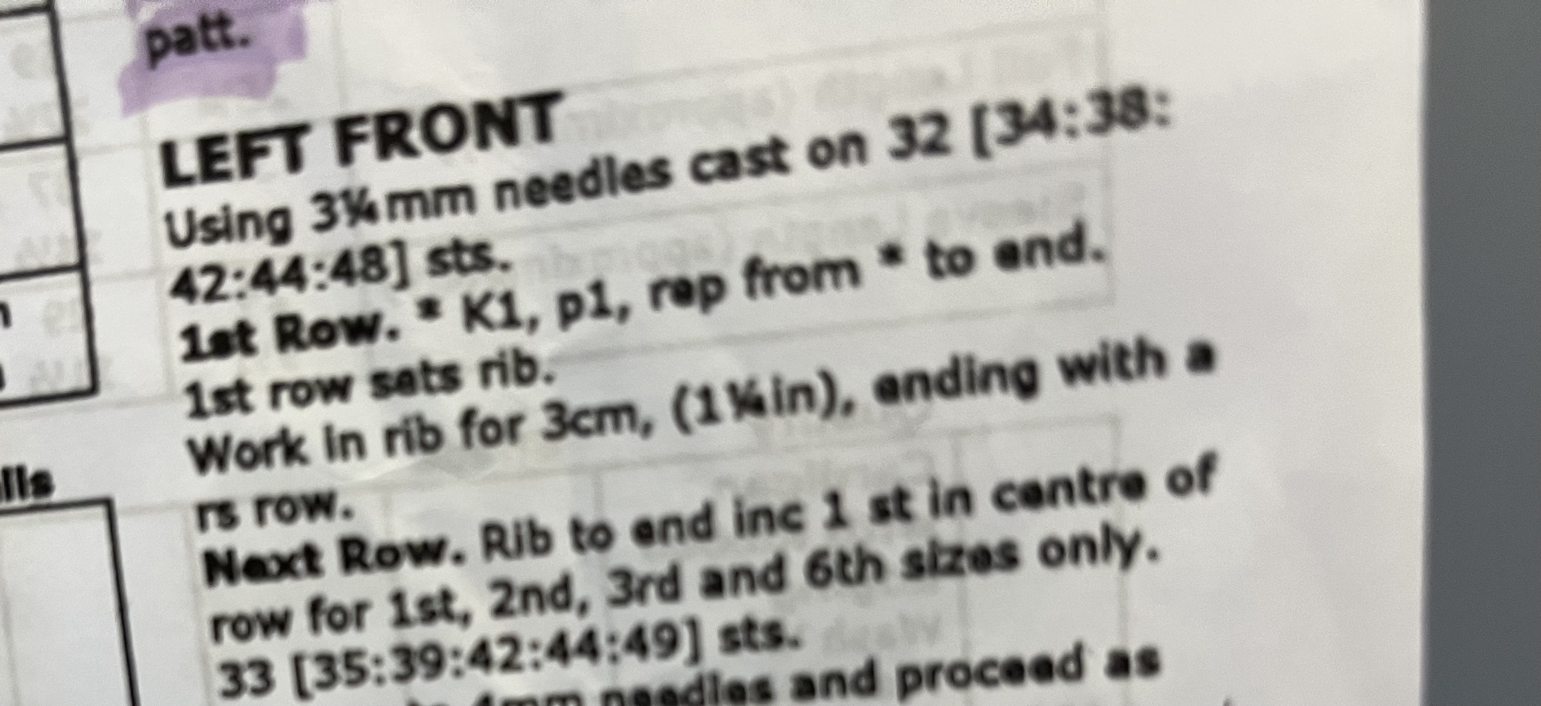 OK, work in k1p1 rib after the cast on row. Continue until you have 3cm rib. End having completed a RS row. The next row, a WS row is also in rib but if you are making the 1st, 2nd, 3rd or 6th size increase one stitch in the middle of the row. If this includes your size, make an increase but don’t let it misalign the rib pattern. It’s ok to have k2 or p2 in the rib because you are about to change the pattern from rib to the main body pattern anyway.